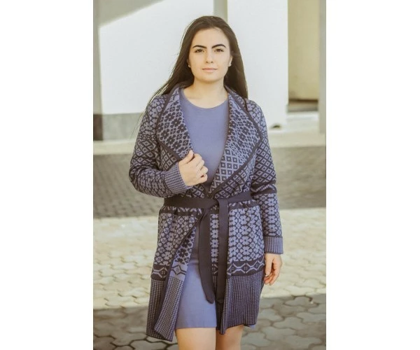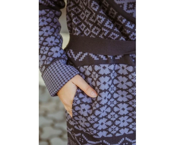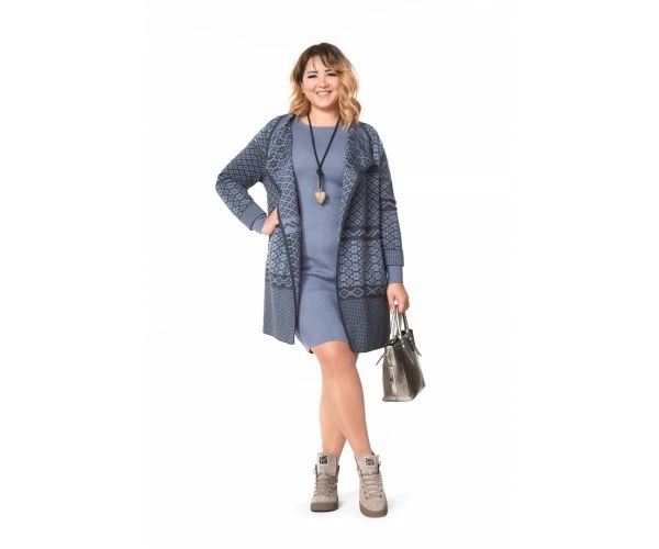 Графитово-сиреневый жаккардовый кардиган с карманами и поясом. Прямой силуэт изделия, а также его мягкость и податливость обеспечивают отличную посадку, как на стройных барышнях, так и на соблазнительных обладательницах пышных форм. Модель Л 751-19 выполнена из качественного плотного полушерстяного трикотажа. Идеальный вариант на холодную погоду!