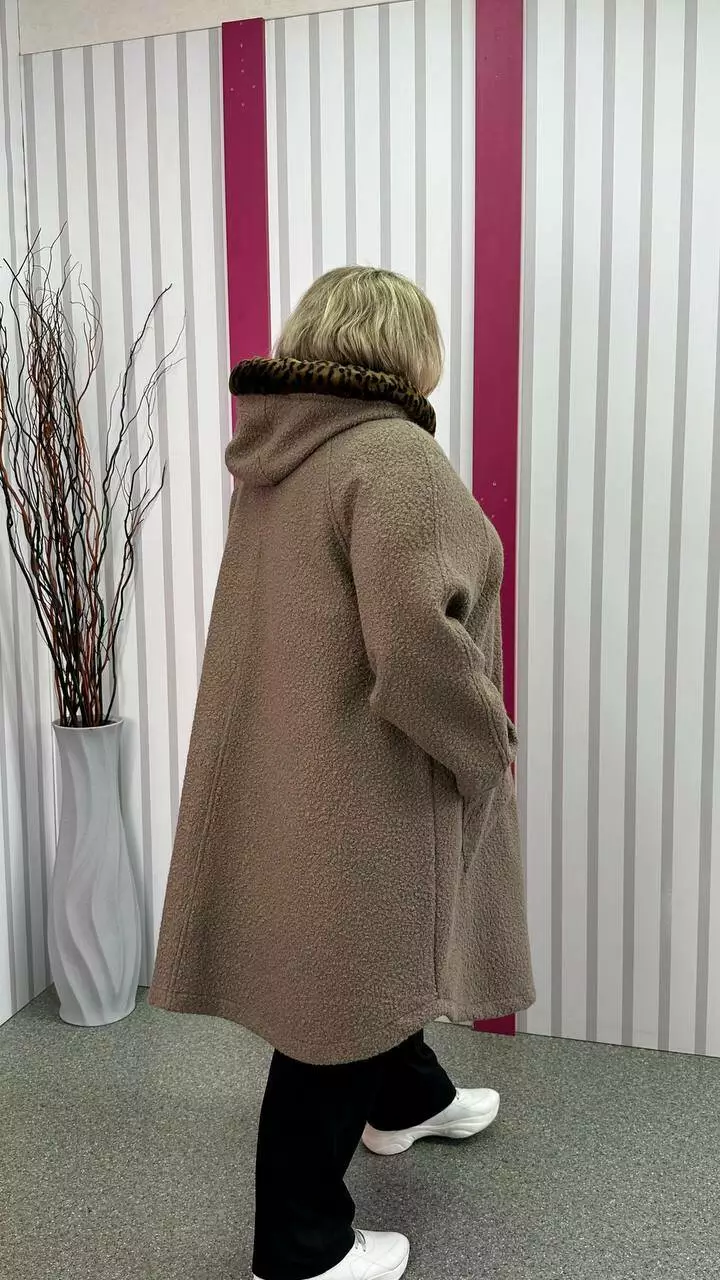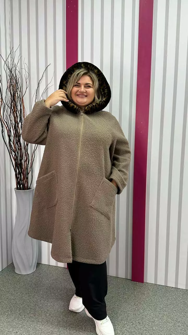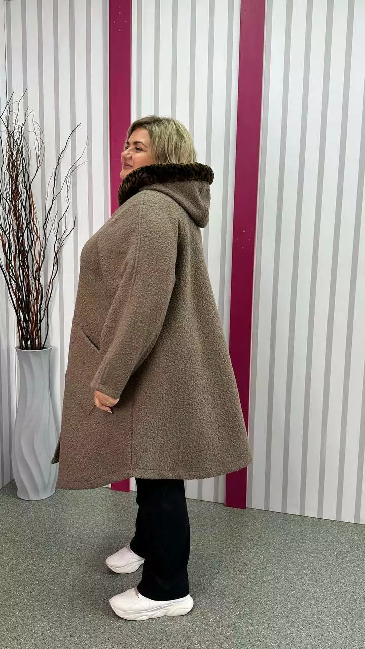 Шикарний кардиган, із щільної пальтової тканини баранчиків, без підкладки з невеликою розтяжністю. Тканина тепла, м'яка і приємна на дотик. Силует клешений, рукав реглан, кишені накладні, дуже зручний капюшон з обробкою із щільного хутра-мутону леопардового забарвлення. Не кошлатиться після прання.