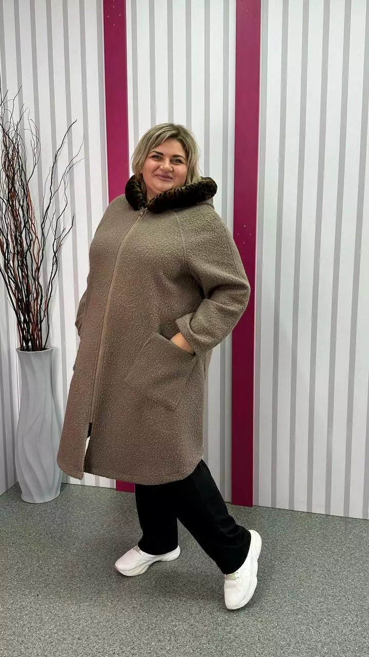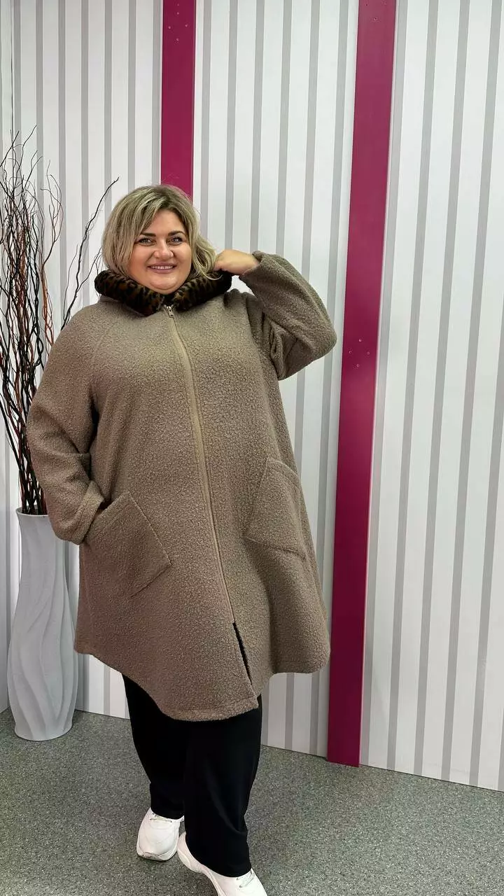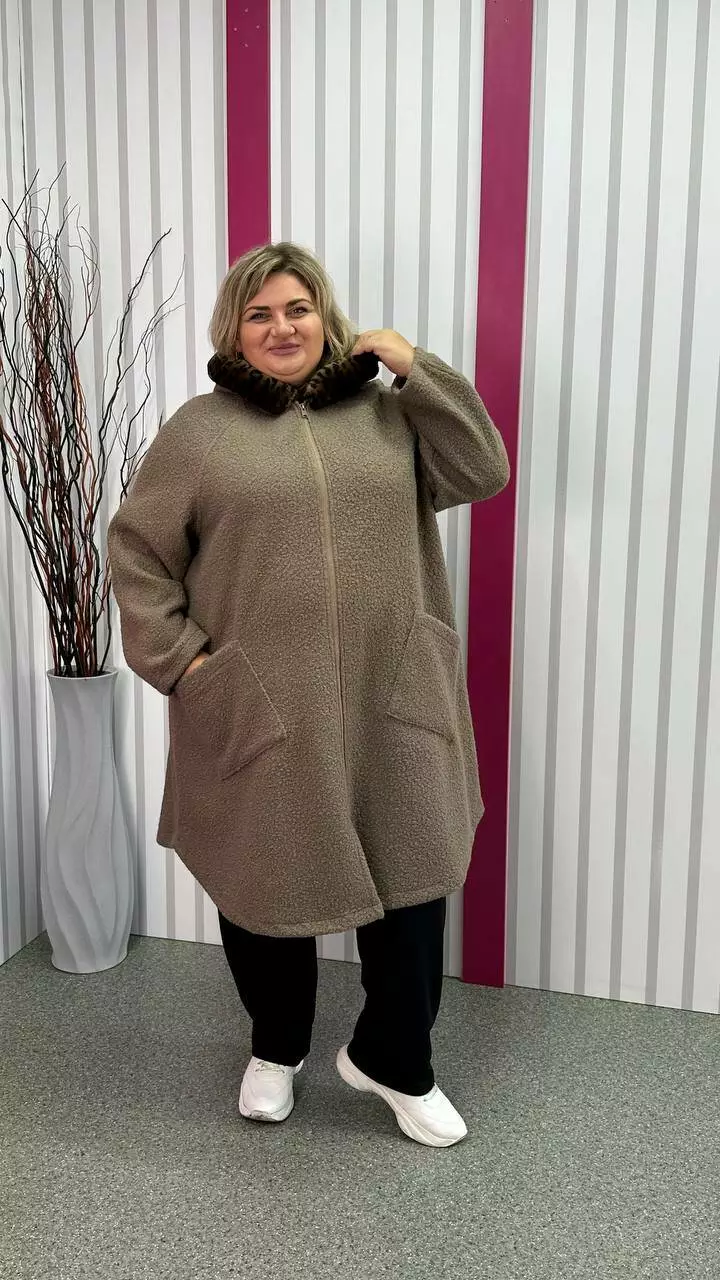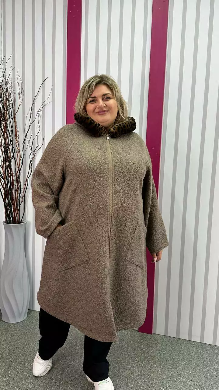 Шикарний кардиган, із щільної пальтової тканини баранчиків, без підкладки з невеликою розтяжністю. Тканина тепла, м'яка і приємна на дотик. Силует клешений, рукав реглан, кишені накладні, дуже зручний капюшон з обробкою із щільного хутра-мутону леопардового забарвлення. Не кошлатиться після прання.