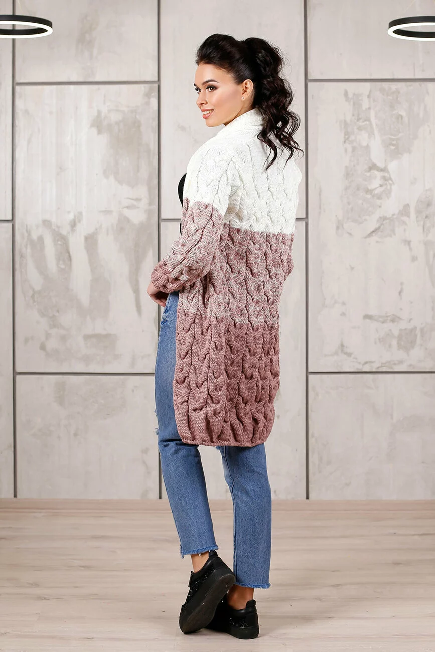 Выполнен объемной вязкой с широкими косами. Низ и рукава изделия