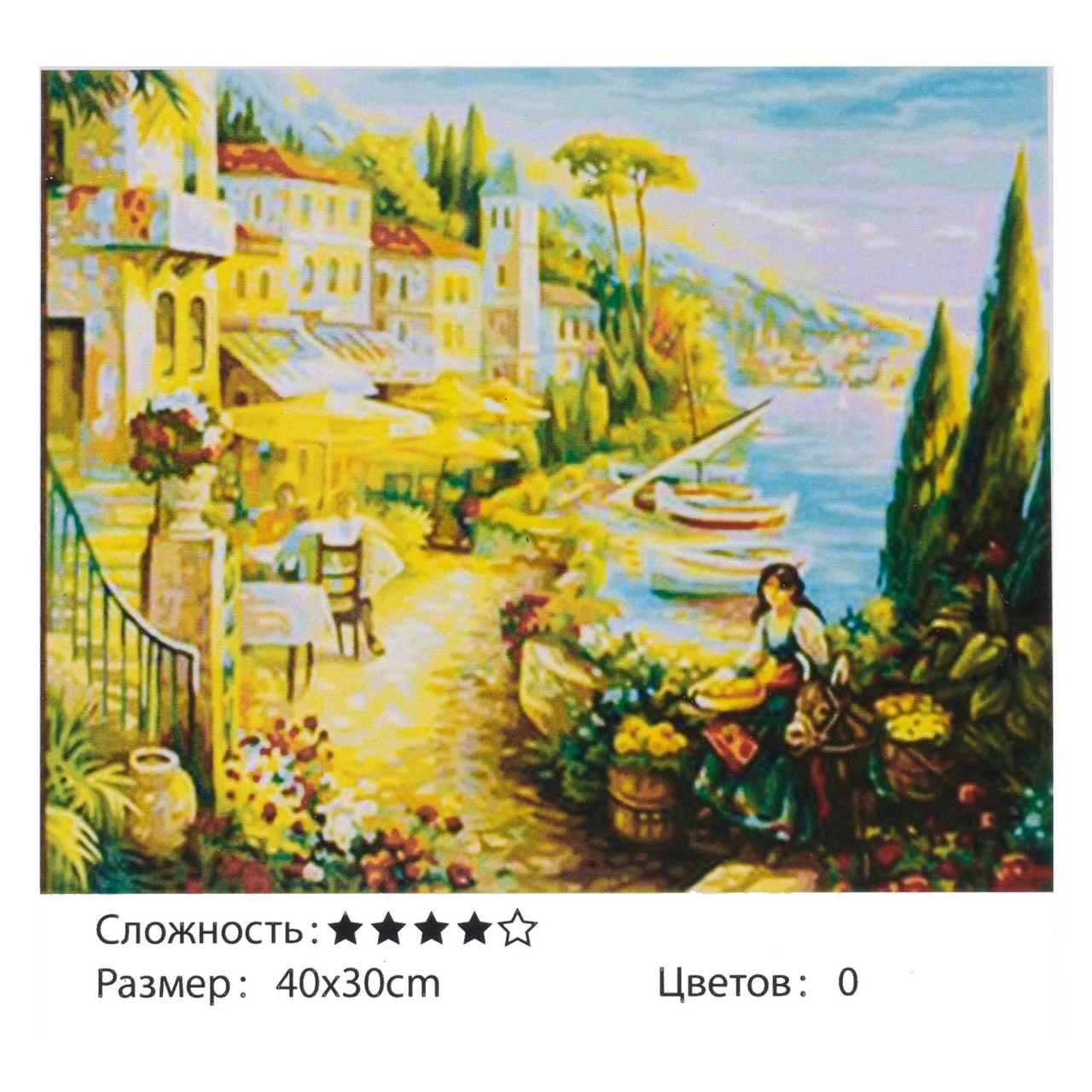 Тип картины - городской пейзаж; Сложность - 4; Материал холста - хлопок; Размер холста - 40 х 30 см. Краски в наборе - есть; Упаковка - коробка. Комплектация: