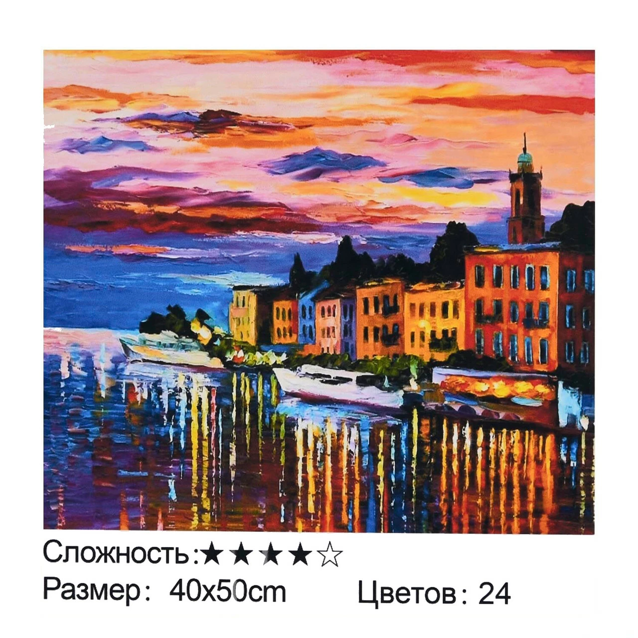 Тип картины - городской пейзаж; Сложность - 4; Материал холста - хлопок; Размер холста - 40 х 50 см. Краски в наборе - есть; Упаковка - коробка. Комплектация:
