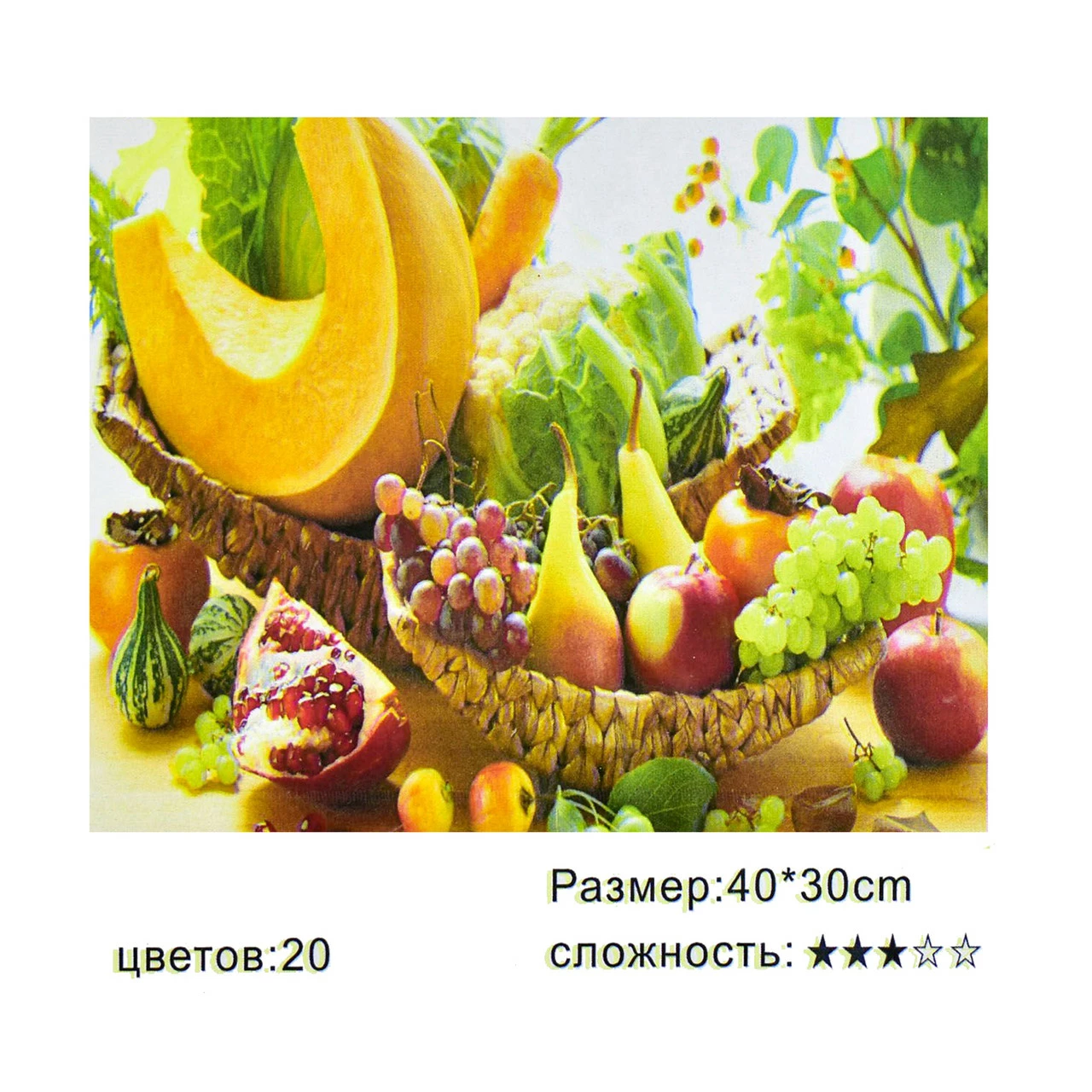 Тип картины - натюрморт; Сложность - 4; Материал холста - хлопок; Размер холста - 40 х 30 см. Краски в наборе - есть; Упаковка - коробка. Комплектация: