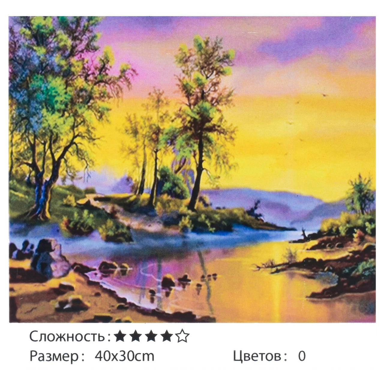 Тип картины - пейзаж; Сложность - 4; Материал холста - хлопок; Размер холста - 40 х 30 см. Краски в наборе - есть; Упаковка - коробка. Комплектация: