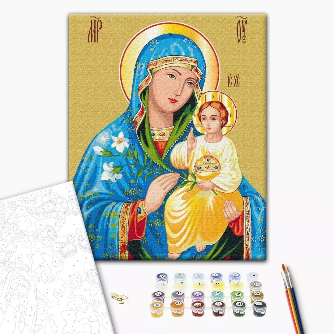 В набір входить: - бавовняне полотно на дерев'яному підрамнику з нанесеною пронумерованою схемою майбутньої картини - 3 пензлики різної товщини - акрилові пронумеровані фарби - кріплення до стіни для готової картини - картина запакована в плівку Зверніть увагу, що кольори можуть несуттєво відрізнятися від показаних на фото!