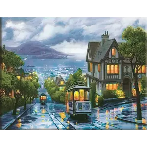 Нічний трамвай – атмосферна картина за номерами. Все, що потрібно для захоплюючого процесу – у комплекті. На спеціальну картонну основу вже нанесено відповідні контури ділянок. Посередині контуру вказаний номер фарби, яку потрібно використовувати для малювання.