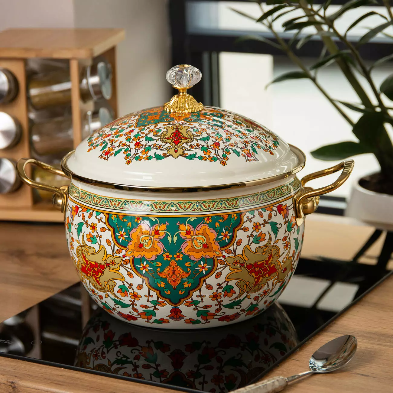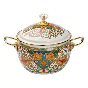 Каструля емальована на 4літри у східному стилі — це витончений елемент кухонного посуду, який гармонійно поєднує традиційний дизайн та практичність. Її дизайн натхненний східними мотивами, що додає нотки екзотики та оригінальності будь-якому інтер'єру. Виготовлена зі сталі, каструля має якісне емальоване покриття, яке забезпечує довговічність і стійкість до подряпин. Завдяки цьому покриттю, вона легко чиститься та зберігає свої властивості протягом довгого часу.