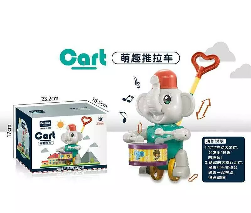 Каталка 0356-2 (32) "Слоненятко", розмір - 13х14х61 см, рухомі елементи, звук барабану, ручка, в коробці