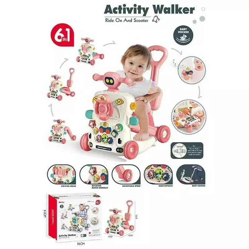 Каталка 6038 (5) рожева, 6 в 1, трансформується у толокар, батьківська ручка, звуки, мелодії, підсвічування, пискавка, сортер, шестерні, в коробці