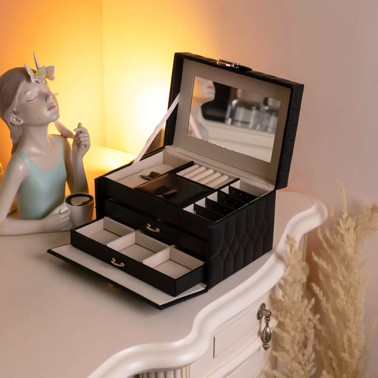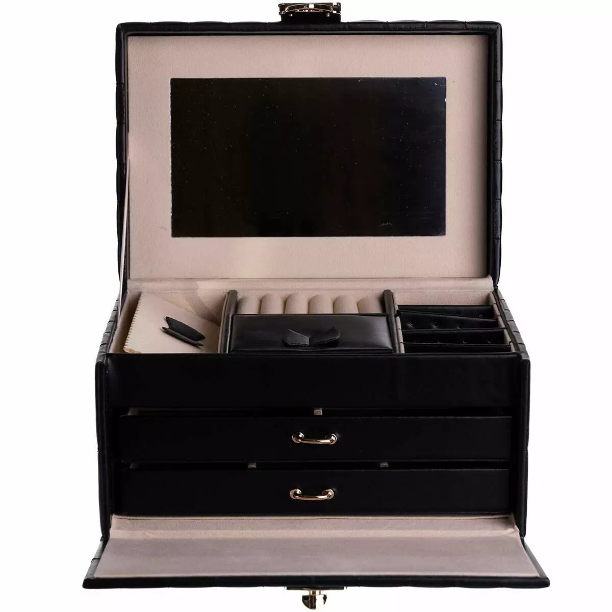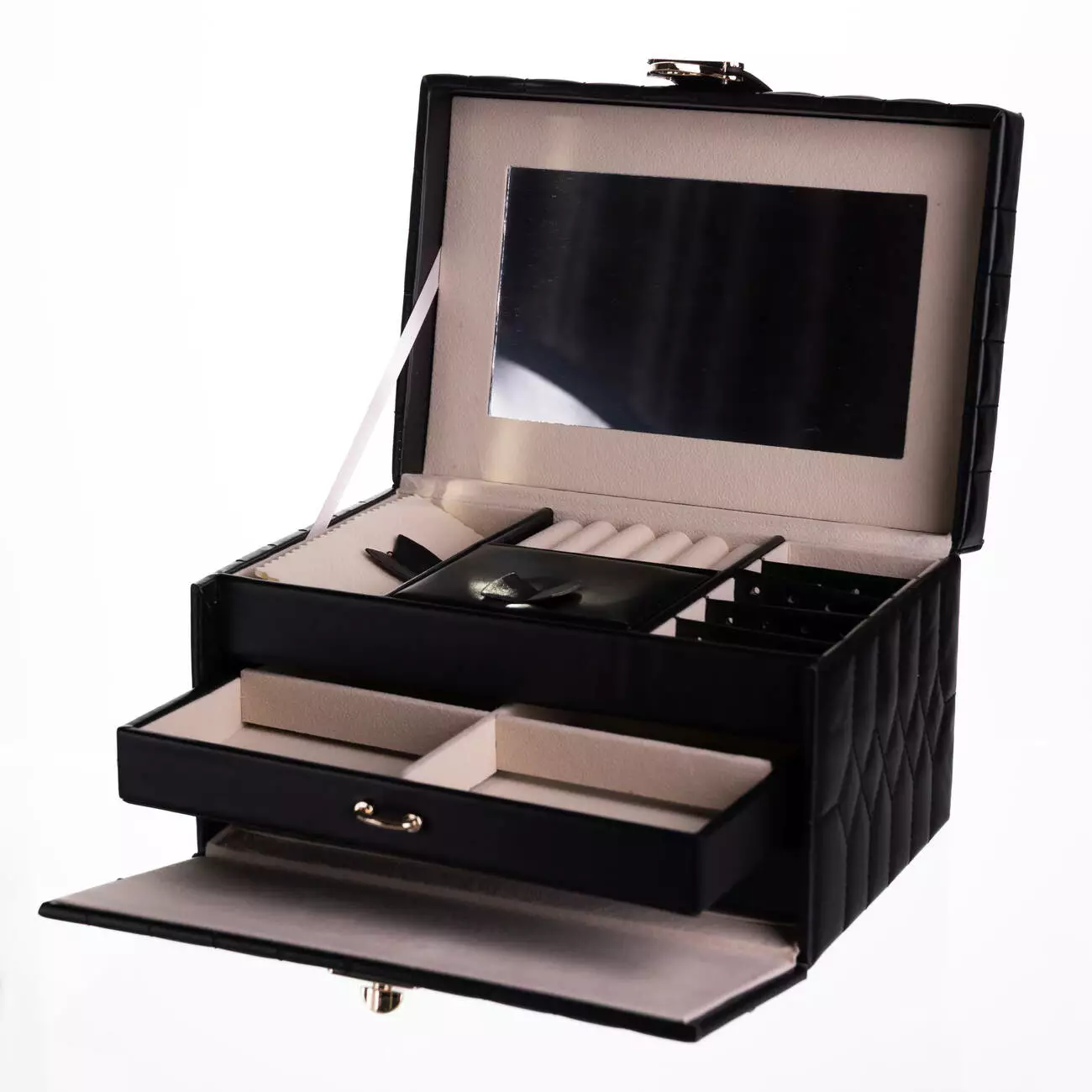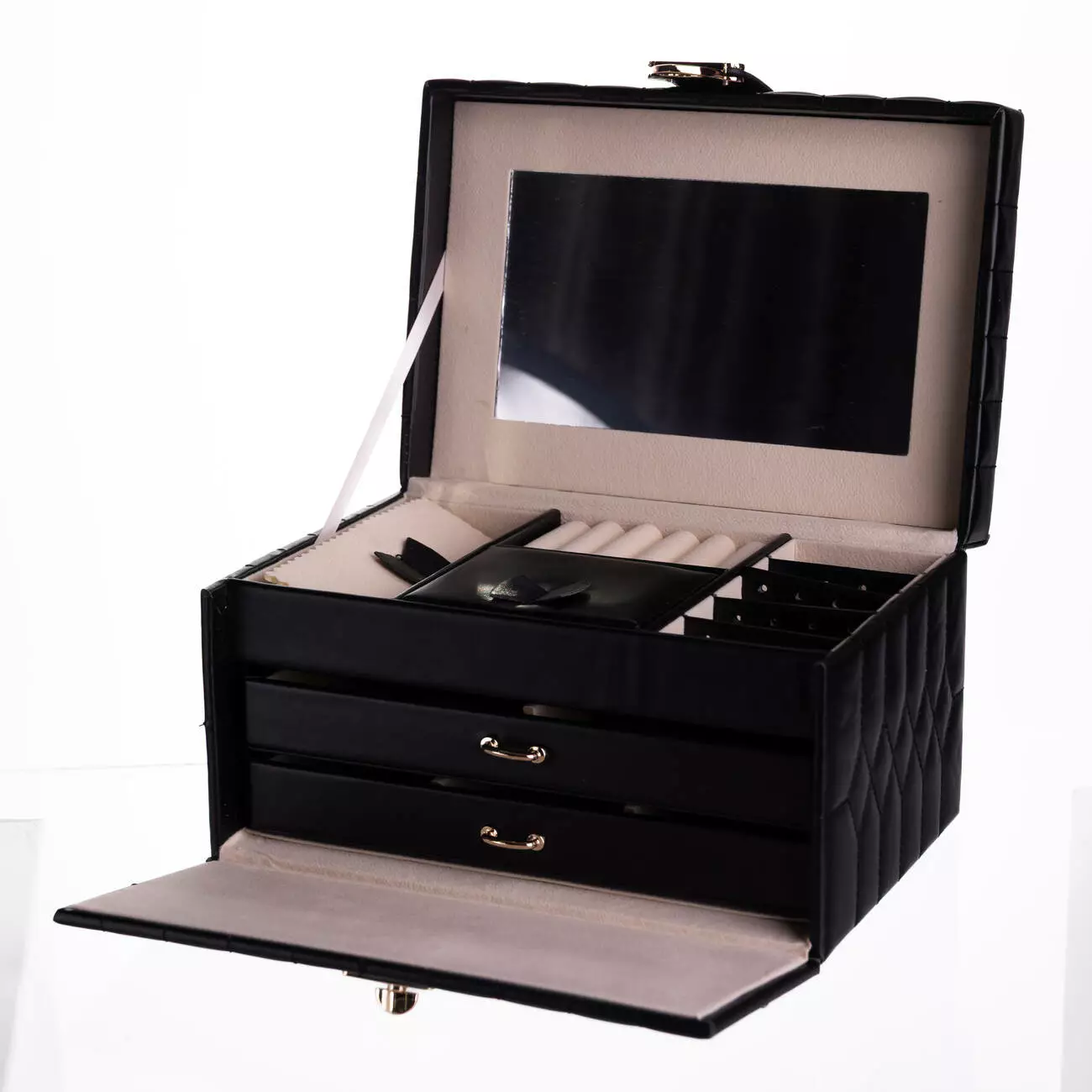 Органайзер доповнений дзеркалом у кришці, що робить його використання ще зручнішим. Скринька щільно закривається, є кнопка, що забезпечує додаткову зручність при транспортуванні.
