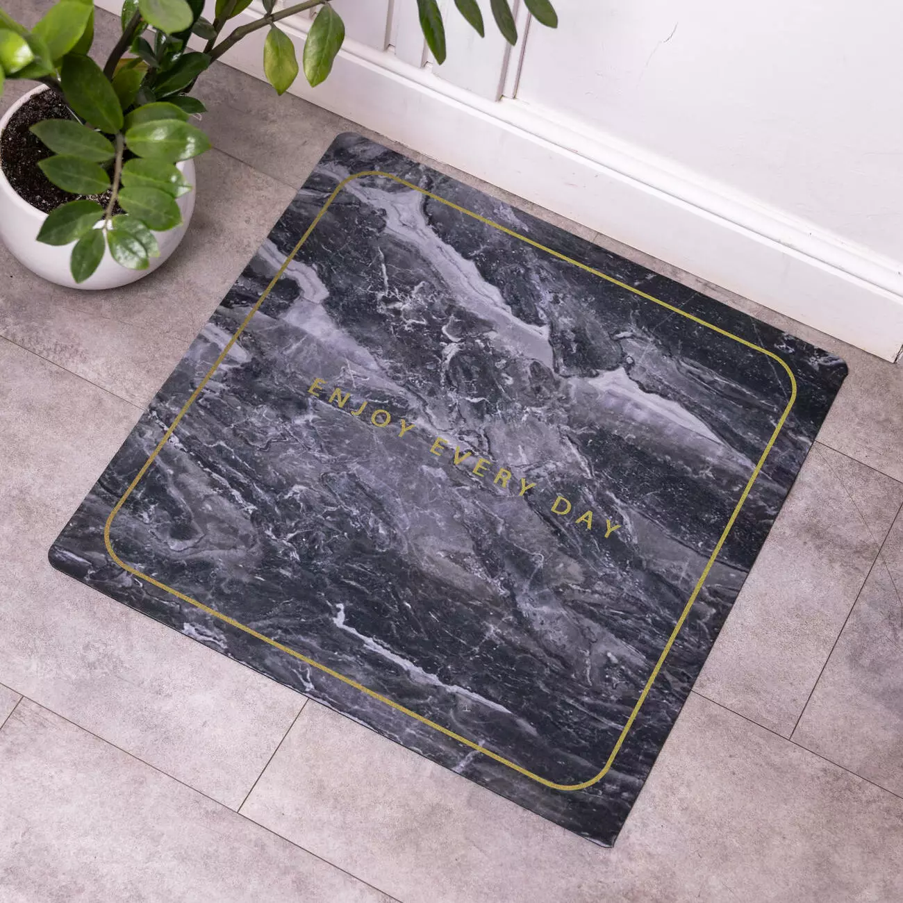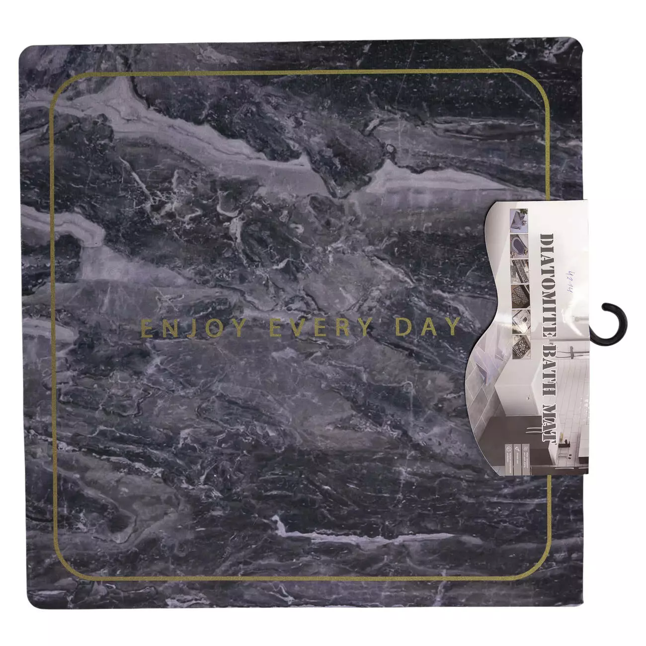 Діатомітовий килимок для ванної кімнати з написом Enjoy Every Day по центру, призначений для використання у приміщеннях з підвищеною вологістю. Дизайн виконаний у мармуровому стилі в сірих тонах, що надає виробу стриманого та сучасного вигляду. Квадратна форма дозволяє зручно розмістити килимок біля ванни, душової зони або умивальника.