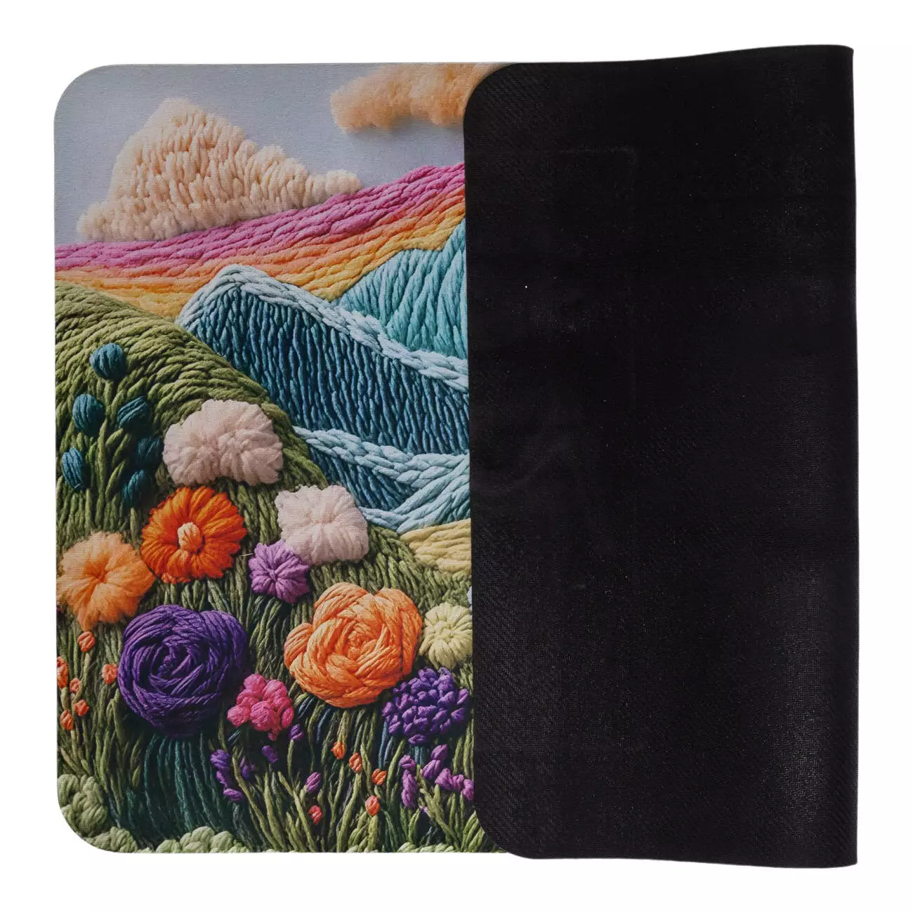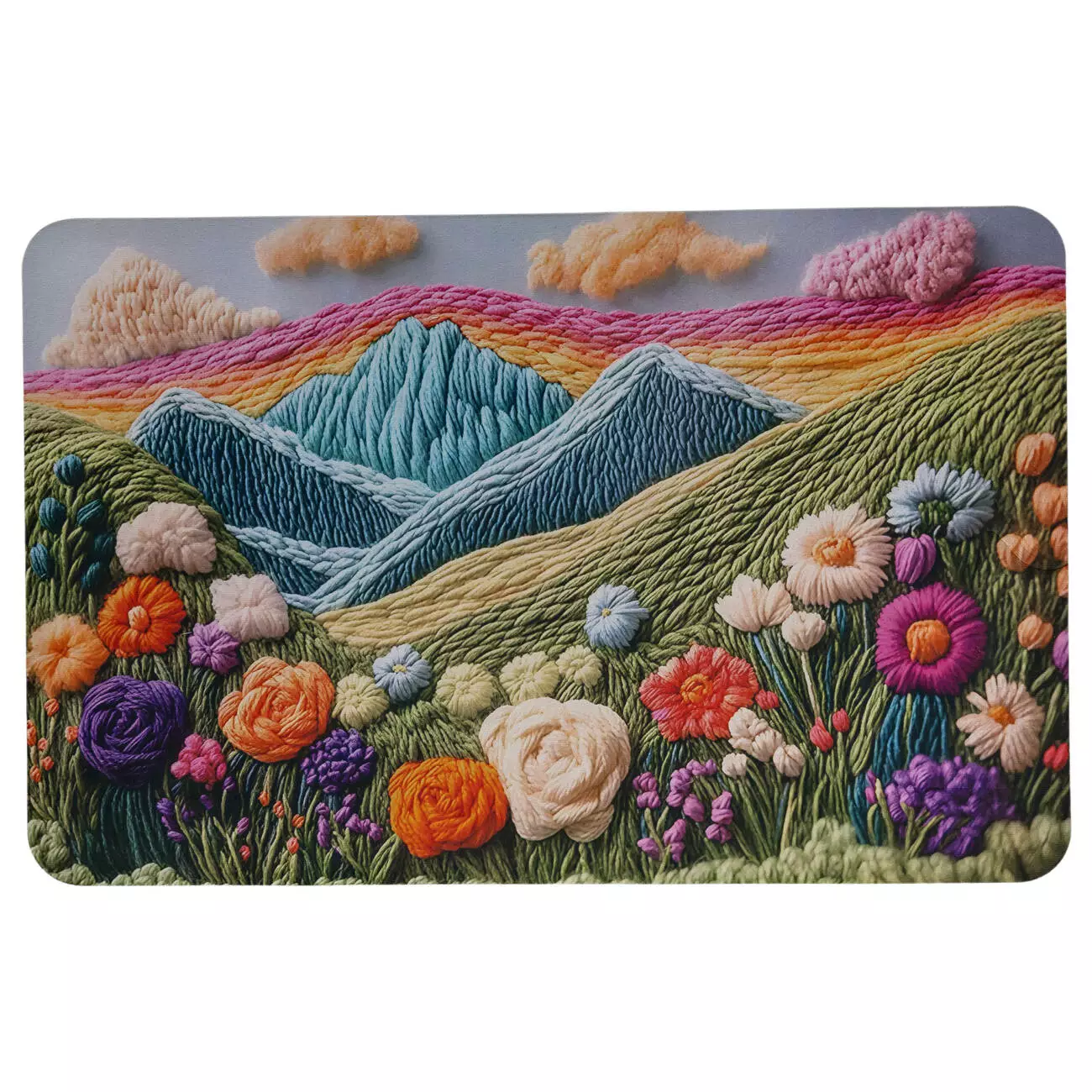Особливість килимка полягає у візерунку з 3D-ефектом, який поєднує елементи пейзажу та флористики, створюючи ефект художнього рельєфу. Завдяки глибині пейзажу та об’ємності квіткових композицій він виглядає як декоративна картина, де кожна деталь ніби виступає над поверхнею і створює відчуття простору та живого мистецтва.