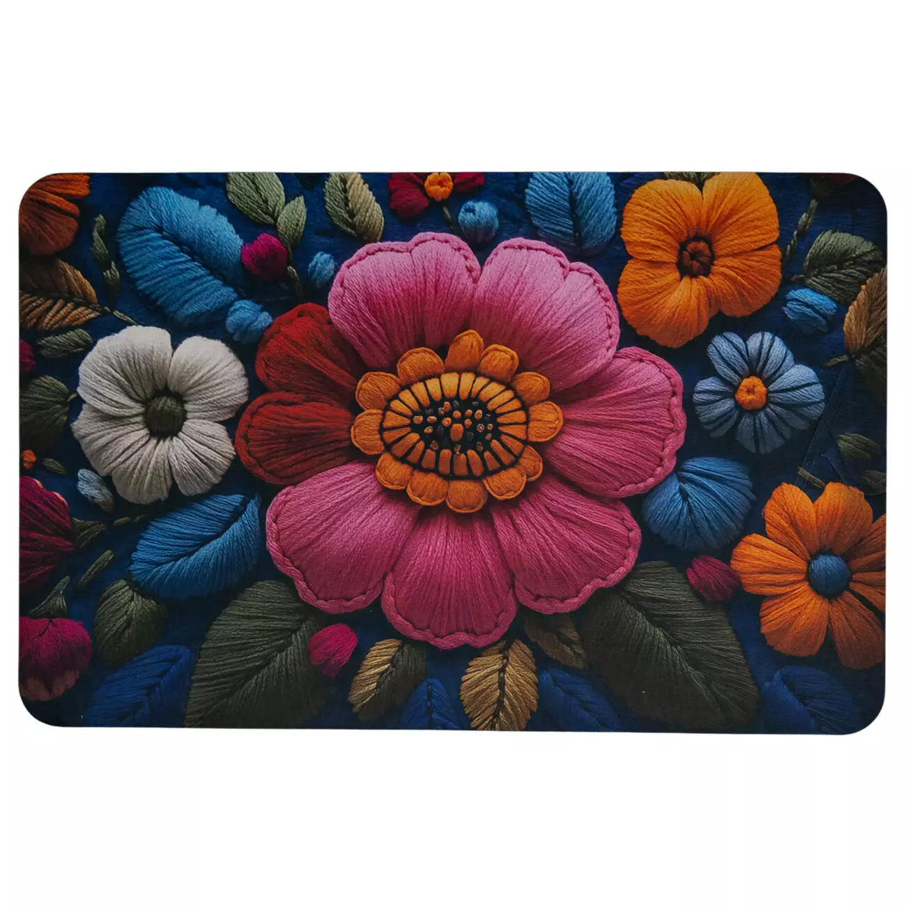 Особливістю килимка є візерунок з 3D-ефектом, який створює ілюзію тривимірної вишивки. Центральна квітка здається піднятою над поверхнею, а кожен елемент ніби має власну висоту, як у рельєфному панно. Завдяки цьому візерунок виглядає живим і об’ємним, ніби квіти щойно розквітли на тканині.
