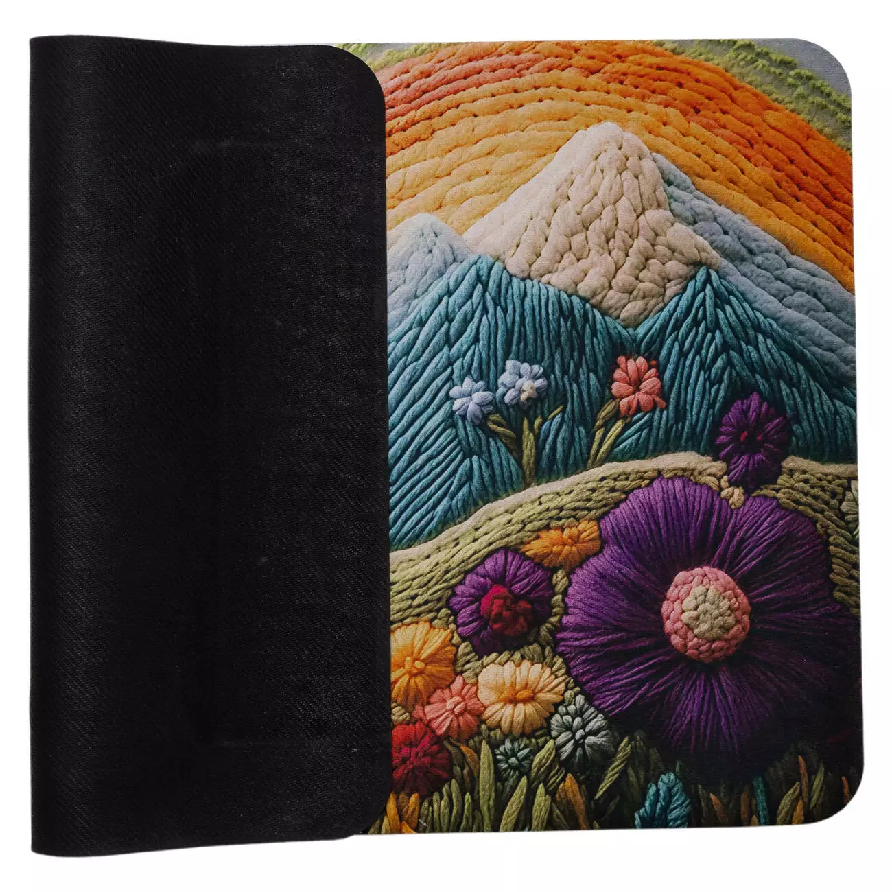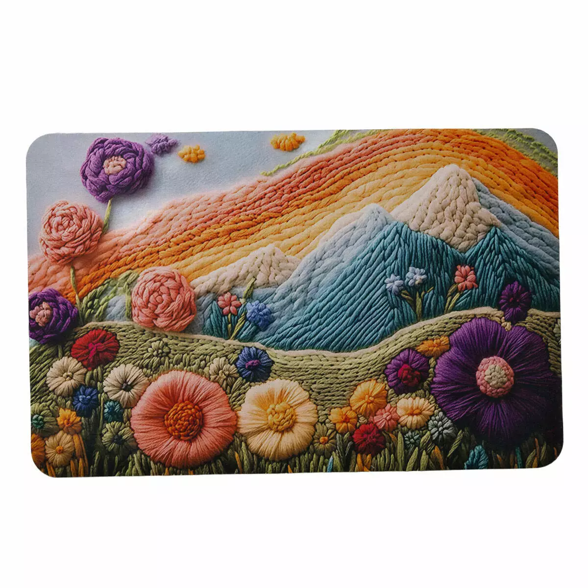 Особливість килимка полягає у візерунку з 3D-ефектом, який поєднує елементи пейзажу та флористики, створюючи ефект художнього рельєфу. Завдяки глибині пейзажу та об’ємності квіткових композицій він виглядає як декоративна картина, де кожна деталь ніби виступає над поверхнею і створює відчуття простору та живого мистецтва.