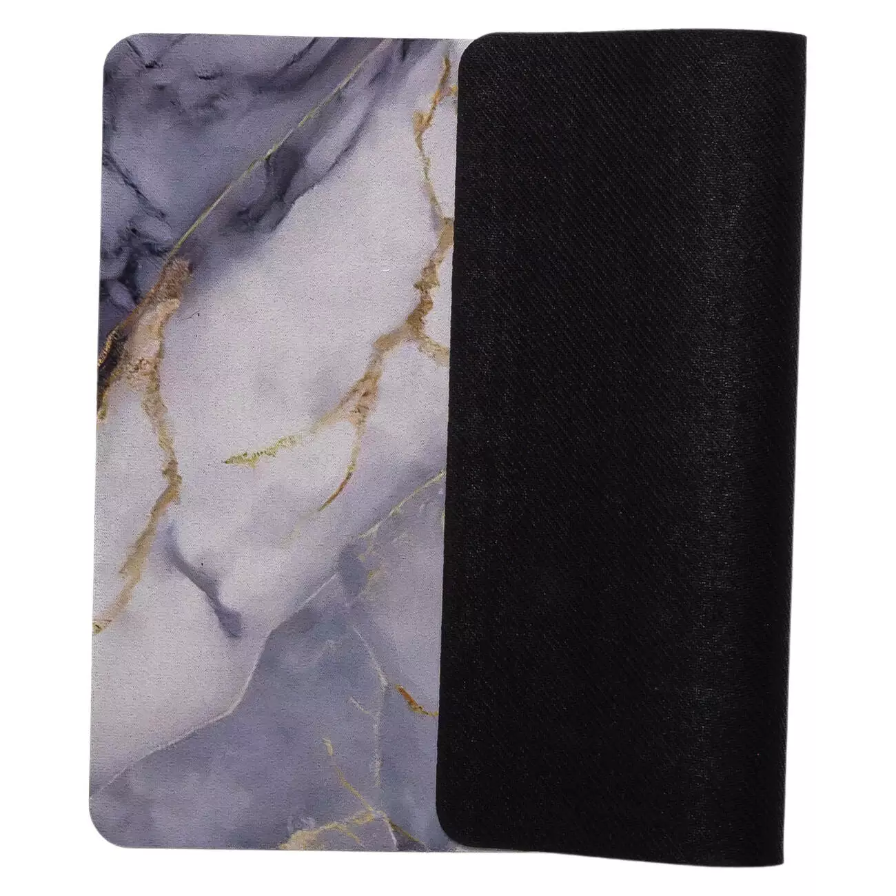 Килимок має мармуровий дизайн у холодній гамі, що нагадує природний камінь. Візерунок сформований плавними хвилястими лініями та глибокими переливами, які створюють стриманий та акуратний вигляд. Поверхня легко очищується — достатньо протерти її вологою тканиною або промити водою без використання агресивних миючих засобів.