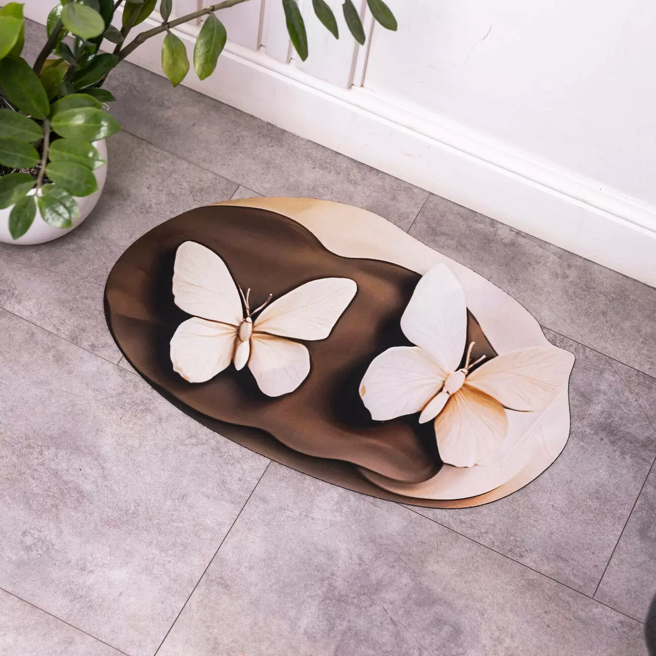 Особливістю килимка є візерунок із 3D-ефектом, який створює ілюзію просторової глибини завдяки великим метеликам із чітко окресленими краями та внутрішніми деталями. Плавні переходи і тіньові акценти на крилах підсилюють тривимірний ефект, а асиметричне розташування метеликів із легким нахилом додає динаміки. Візуально складається враження, що вони зависли над поверхнею або щойно приземлилися.