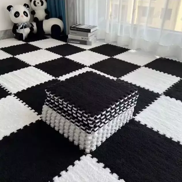 Плюшева підлога-пазл - це модульні плитки для підлоги з EVA-піни з м'яким текстильним покриттям. Кожен елемент (30 x 30 см) оснащений замковими з'єднаннями, що дає змогу легко складати їх у великий килимок будь-якої форми. Плюшева поверхня робить килимок комфортним, теплим і м'яким для підлоги. Ідеально підходить для дитячих кімнат, ігрових зон, місць відпочинку, теплих і м'яких килимків на підлогу.