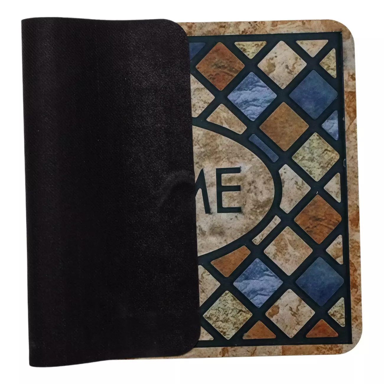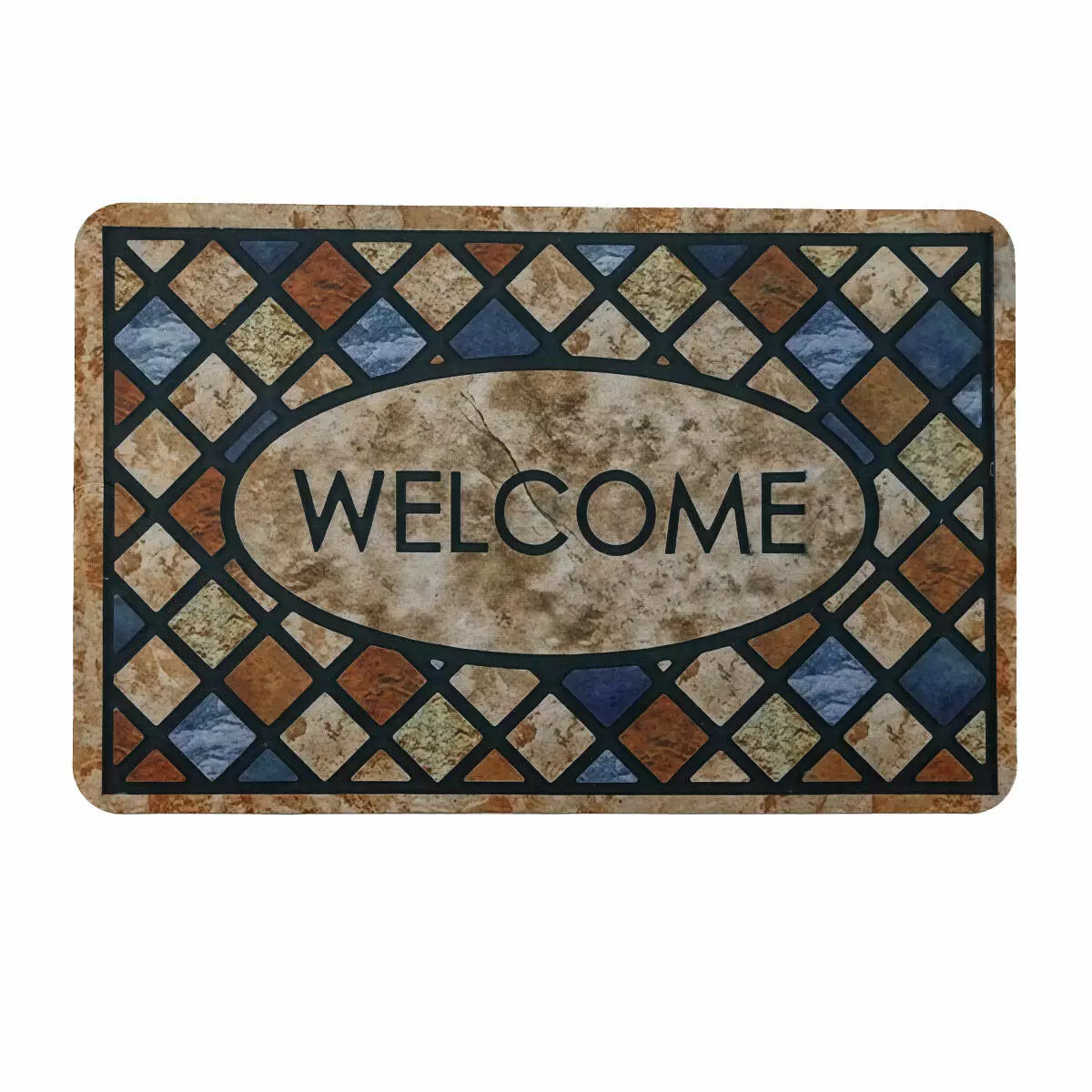 Особливістю килимка є візерунок із ритмічним орнаментом у формі ромбів, які утворюють декоративну рамку навколо центральної овальної зони з написом "WELCOME". Така композиція створює елегантний акцент на вході та підкреслює гостинну атмосферу, додаючи передпокою охайності та стилю.