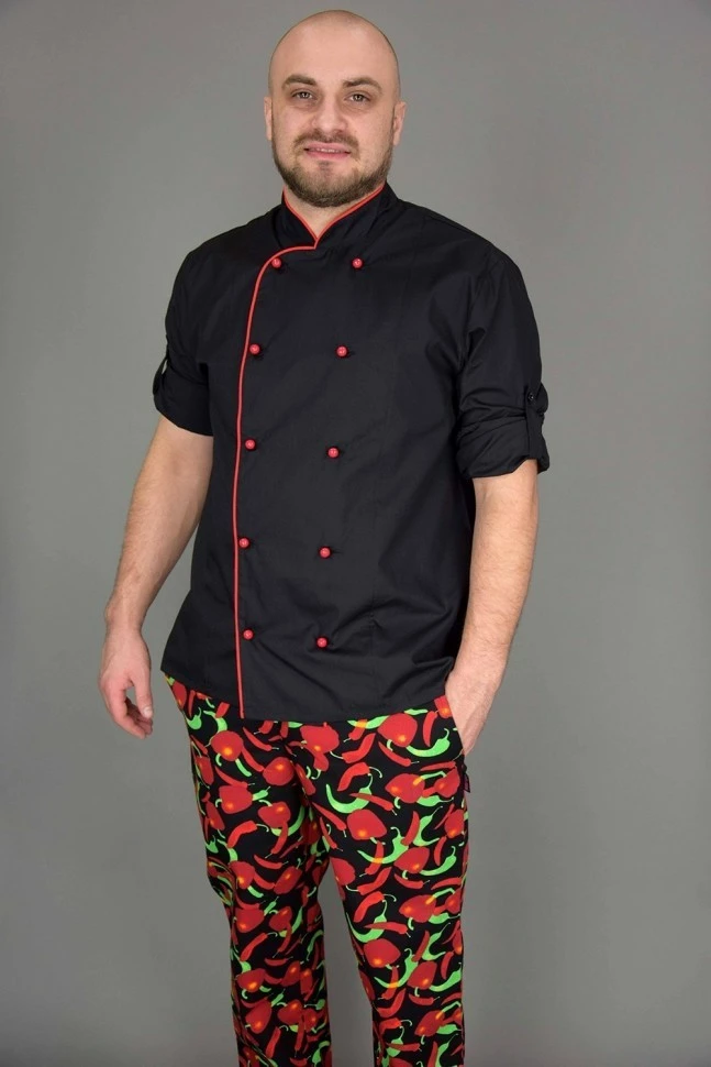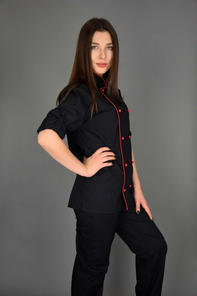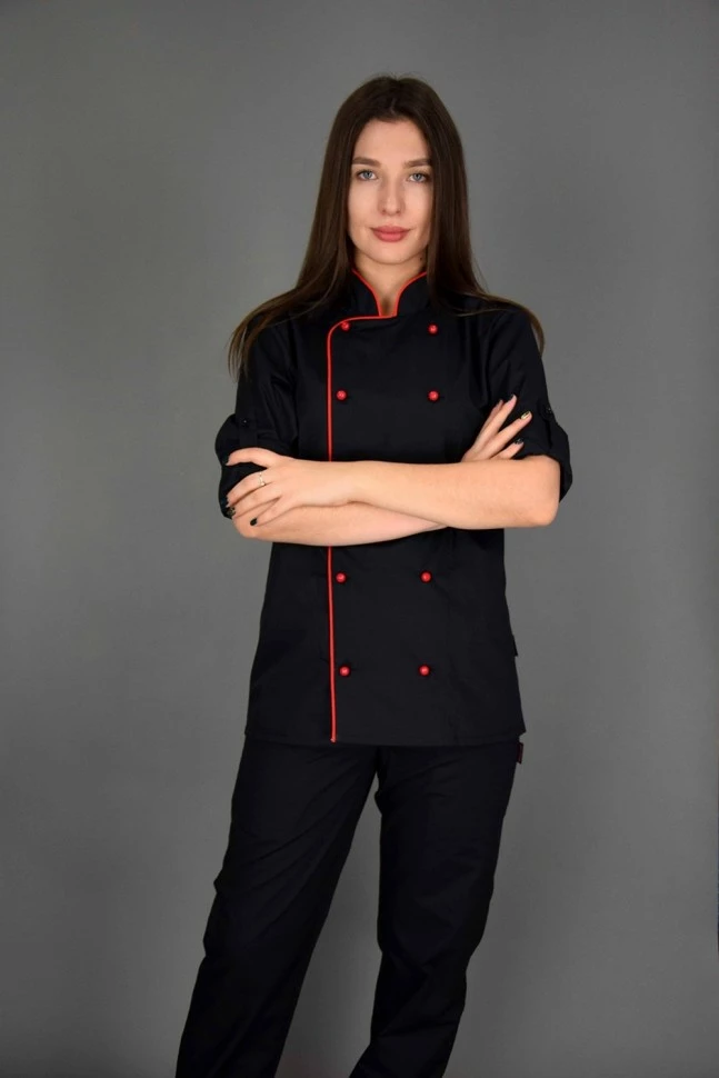 Поварская униформа - куртка-китель, черного цвета с красным тканевым кантом по краю ворота-стойки и борта. Двубортный китель полуприлегающего силуэта, застегивающийся на два ряда специальных пуговиц (пукли) красного цвета. Рукав втачной, длинный, но с возможностью подворота при помощи хлястика внутри рукава, фиксирующий рукав на пуговицу.