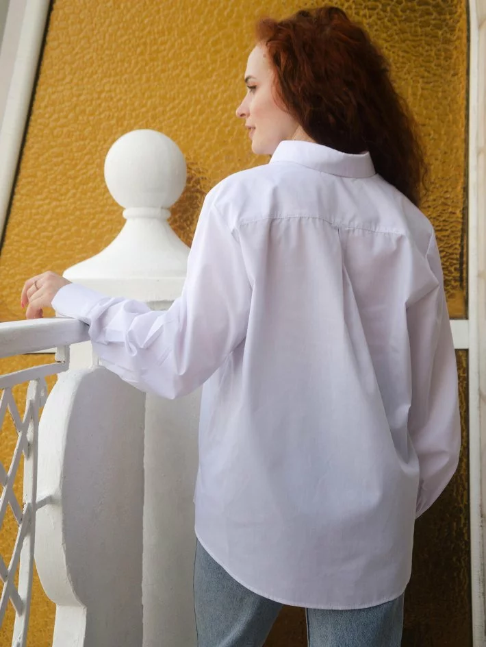 Класична біла сорочка оформлена чорними гудзиками та кишенею