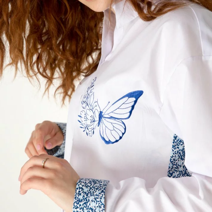 попереду. Сині гудзики на блузі підкреслюють її оригінальність.