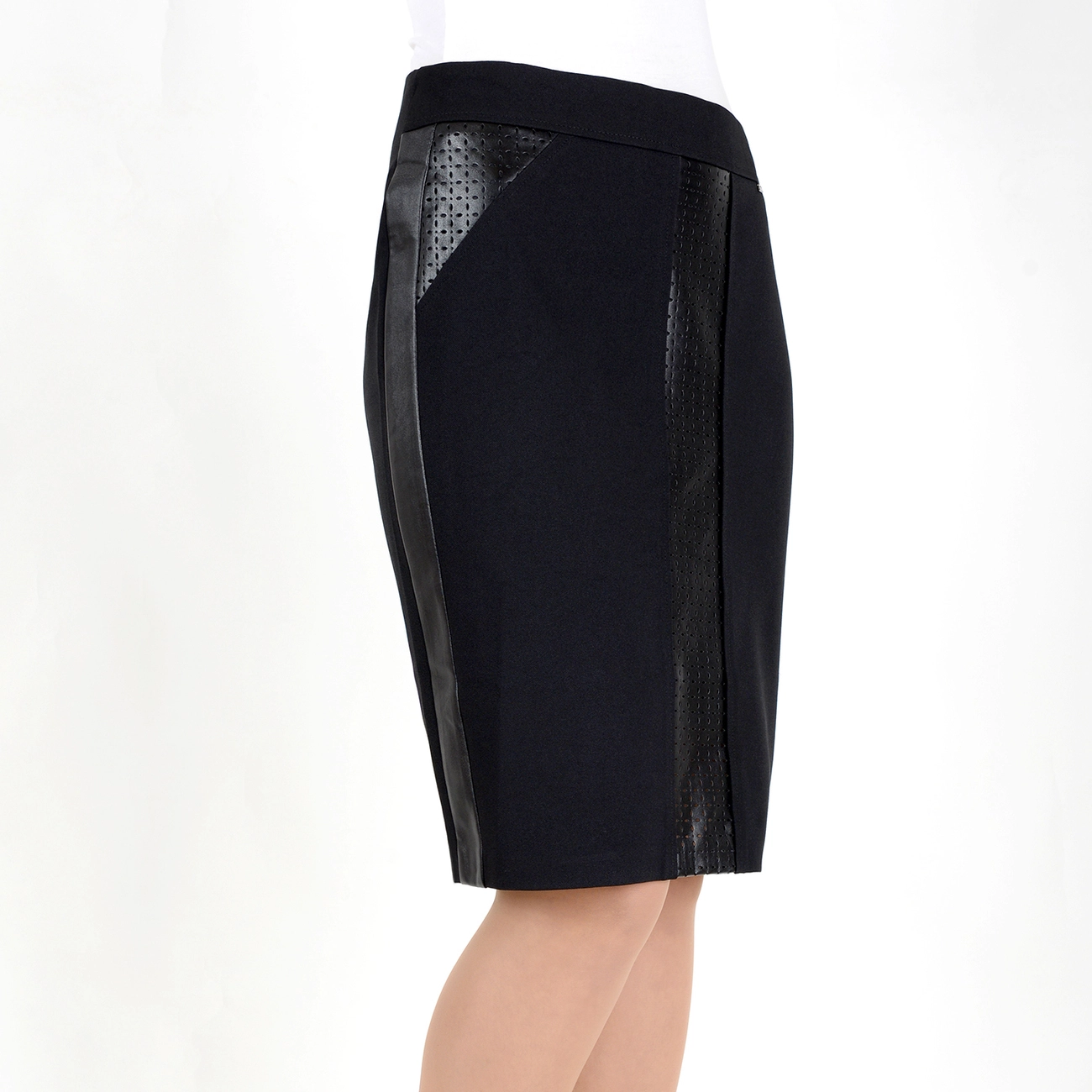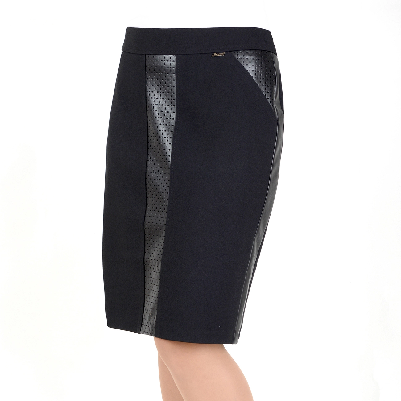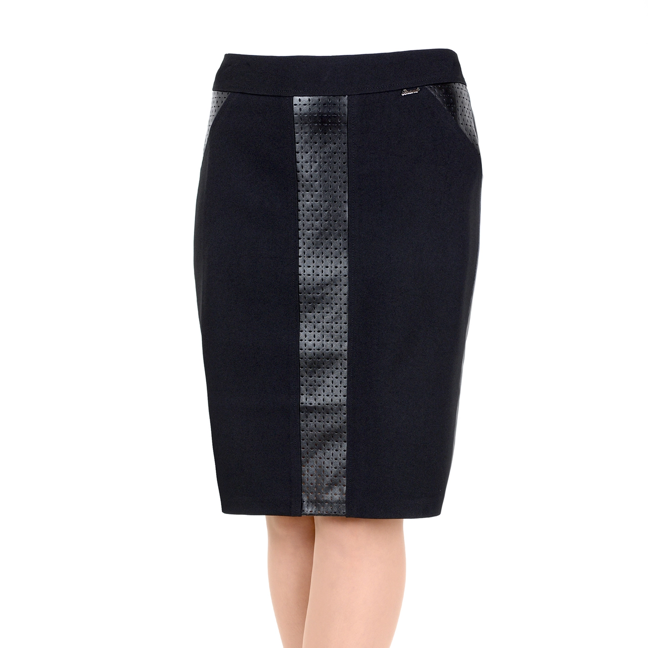 Классическая юбка-карандаш со вставками из искусственной кожи. Эта модель дополнит модный и современный образ. |