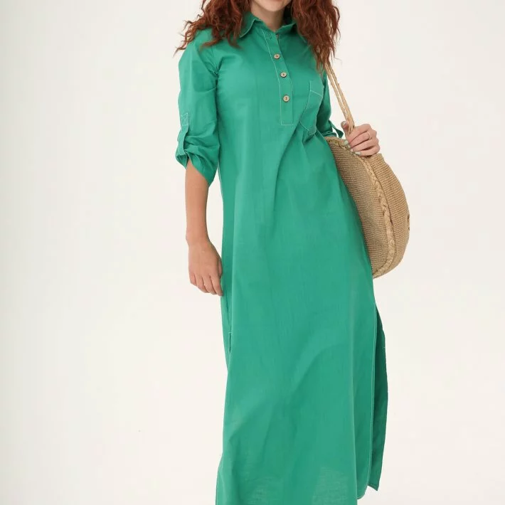 Сукня-сорочка з юбкою максі, має класичний комірець-стійку.