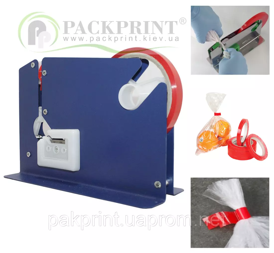 Узкий скотч(клейкая лента) заправляется и укладывается таким образом, чтобы клеевая поверхность была расположена сверху аппарата. Затем, уже свернутую, верхнюю часть горловины пакета, оператор пропускает через рабочую часть аппарата. Там и происходит заклеивание узким скотчем (клейкой лентой) горловины пакета. Обрезка клейкой ленты, происходит при помощи ножа, расположенного сбоку аппарата. Таким образом, заклейка пакета узким скотчем (клейкой лентой) и обрезка клейкой ленты производится одновременно и при этом ,не требуется подключение к сети, Весь процесс упаковки занимает несколько секунд. Диаметр свернутой горловины у пакета должен пройти в приемную шестеренку аппарата. Если у клипсатора имеется боковой нож, то им можно воспользоваться и при необходимости произвести обрезку горловины пакета или мешка.