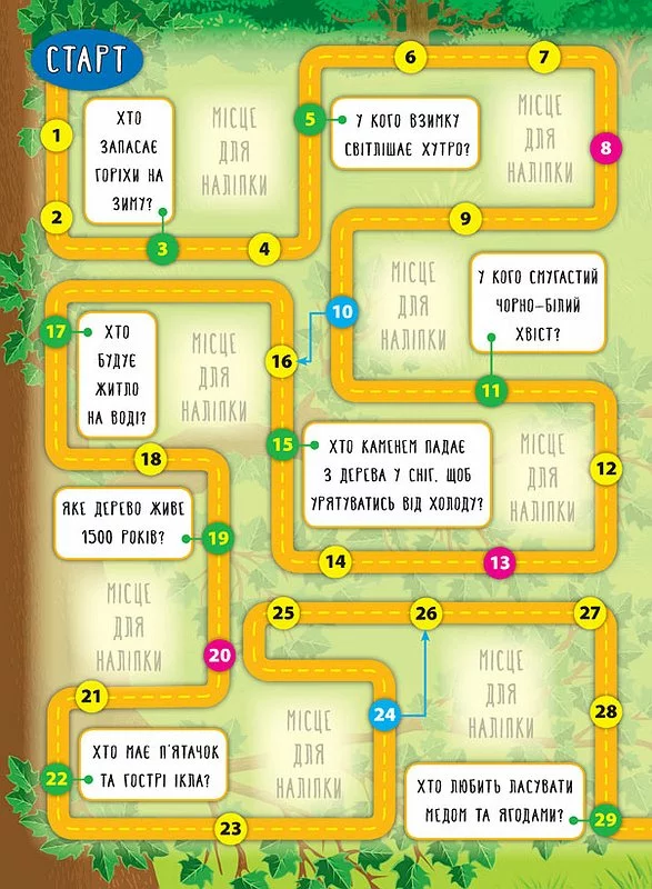Це видання познайомить дитину зі світом лісу — тваринами, птахами, деревами, ягодами й грибами. У кінці книги малюк знайде захопливу настільну гру, що допоможе весело провести час із друзями, закріпити здобуті знання та пограти з яскравими наліпками, що містяться у виданні.