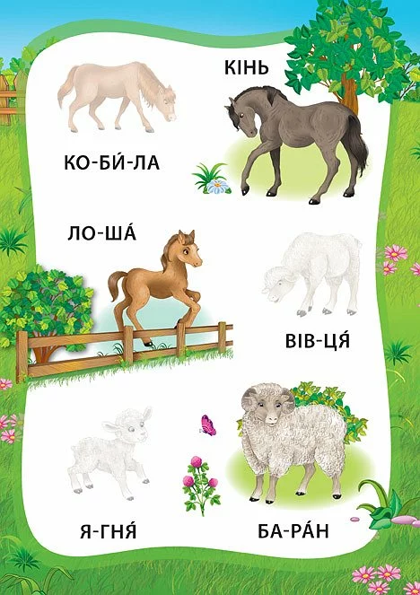 Ця книжка допоможе малюкам навчитися читати по складах і запам’ятати назви свійських тварин та рослин, що ростуть на подвір’ї та городі, розвинути дрібну моторику пальців рук, зорову пам’ять й увагу. Видання містить яскраві ілюстрації, тематичні наліпки й підписи до кожного малюнка. Крім того, слова поділені на склади та надруковані зручними для сприйняття великими літерами. Усе це зробить складний процес читання легким і захопливим.