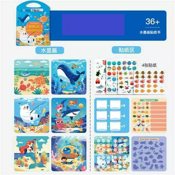 Логічна книжка C 75338 (80) "Морські жителі", водна розмальовка, пензлик, наліпки, завдання, у плівці