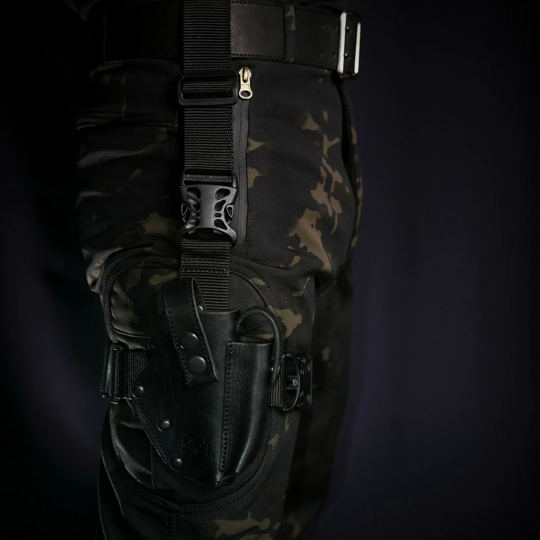 • Кобура не знімна, пришита до системи стегна. Стропа, гумка, фастекси міцні. Ширина фастексів 4 см