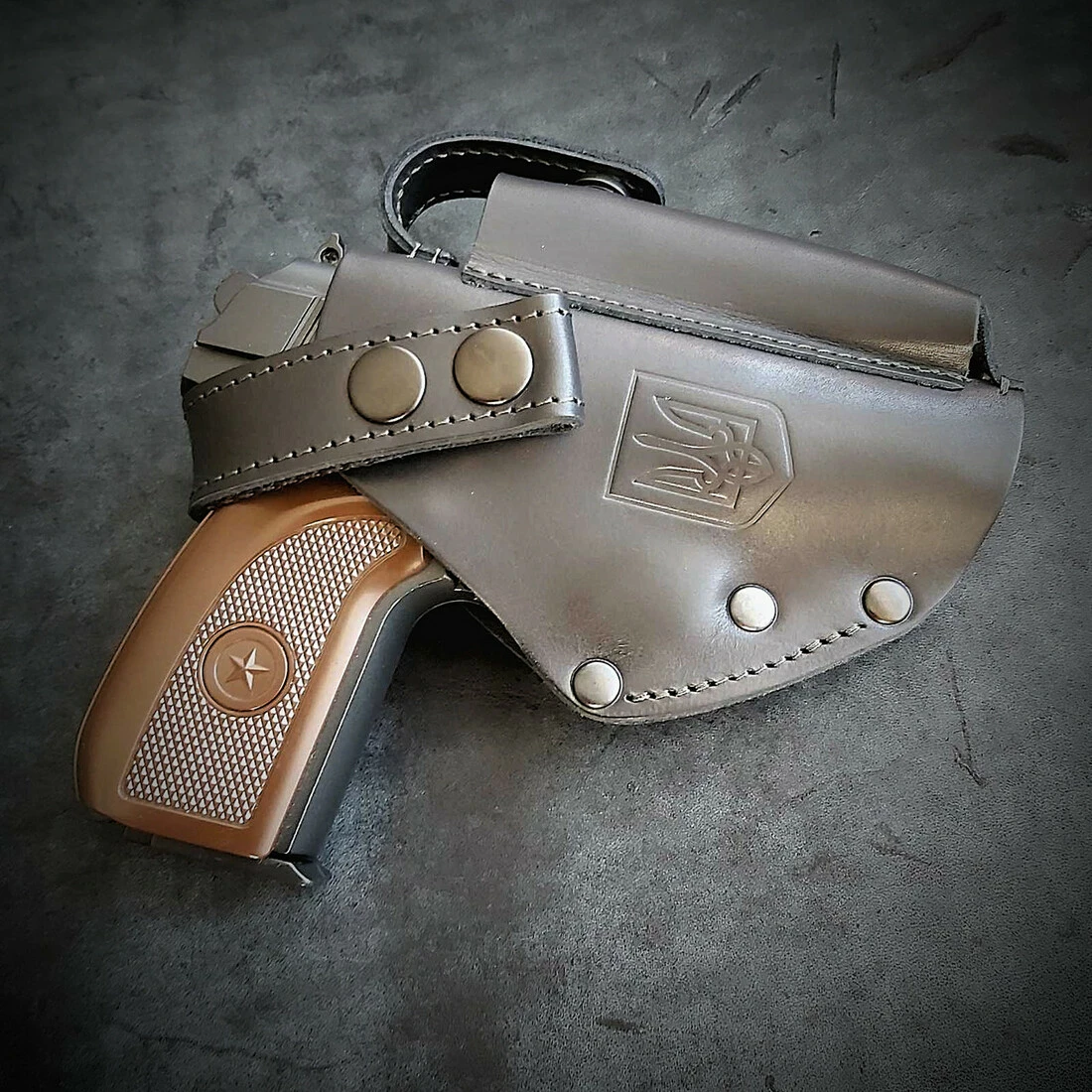 Кобура поясна під ПМ, виготовлена з натуральної шкіри. З тисненням герб України. Колір чорний
