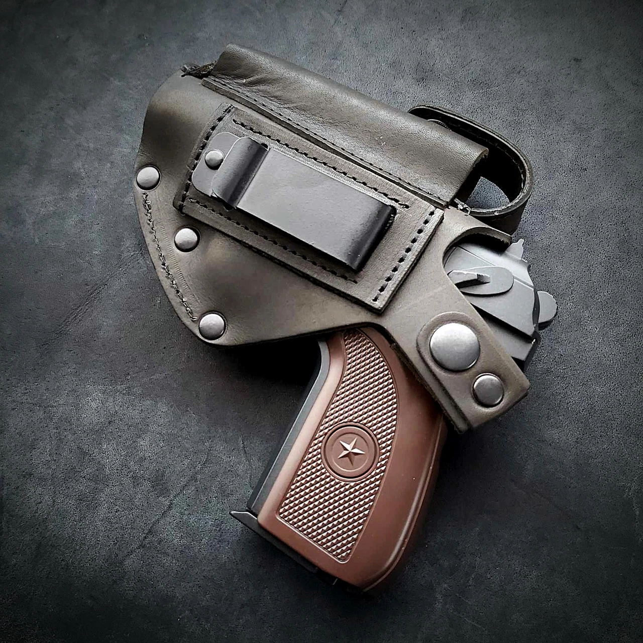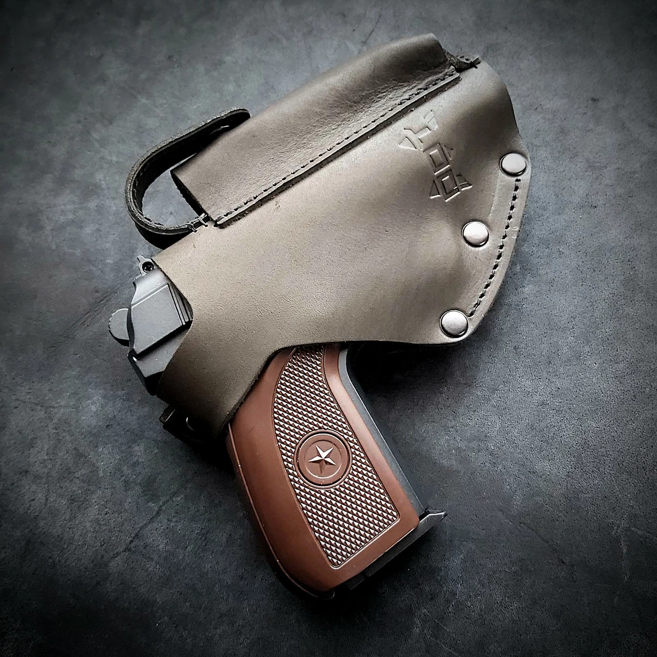 Кобура поясна під ПМ. Виконана із щільної натуральної шкіри. Колір темна олива Пістолет та магазин фіксуються на кнопках. Кріпиться на ремінь за допомогою скоби, а також простягнувши ремінь крізь отвір. Підходить під ремінь 5 см завширшки Скоба міцна металева Виробник Україна