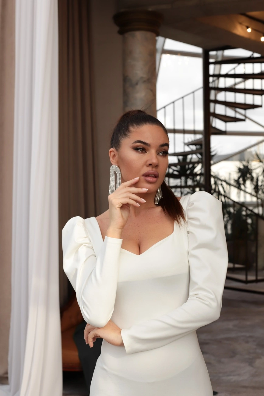 Оригинальные рукава буффы и металлическая разьемная молния по спине.