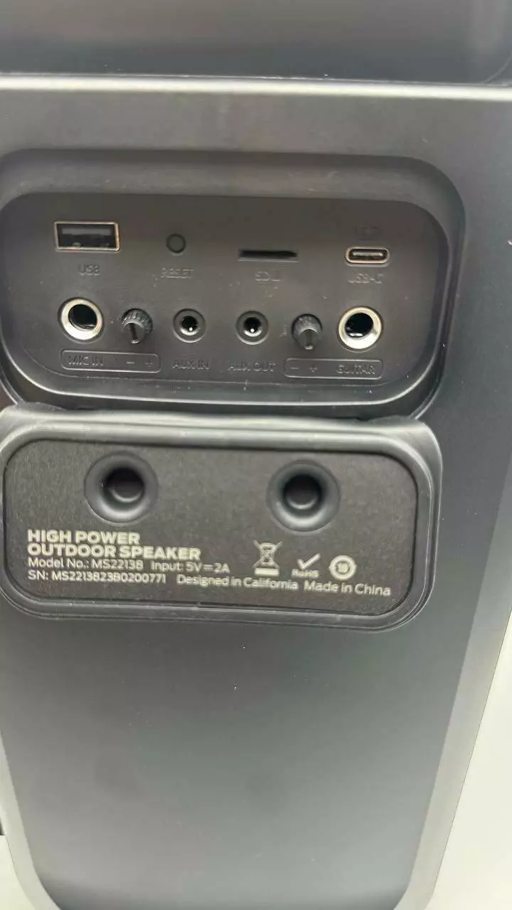 1.Bluetooth:V5.3 2.Output Power:80W 3. Input:BT / AUX / TF / U Disk / MIC / GUITAR 4.Battery:7.4V/4000mAh 5.Driver Size:5”*2+2”* 2 6.RGB Color Lighting Effects 7.Charging Port:USB-C 8.Water Resistant:IPX4 9.Dual wireless microphones 10.Product Size:433×234×208mm