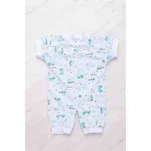 Ясельний комбінезон з коротким рукавом, з принтованого куліру. Виріб з укороченими ніжками, що не розраховано під підгузник. По всій довжині застібається на кнопки.