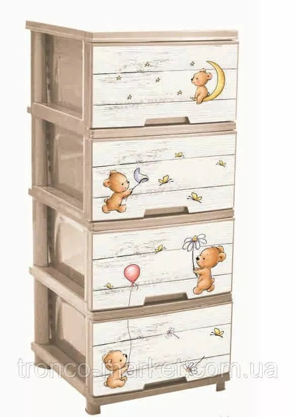 Новинка от украинского производителя АЛЕАНА - комод на четыре ящика с декором. Комод (фр. commode — «удобный») — предмет французской мебели с выдвижными ящиками для хранения одежды. Разработан с целью помочь вам грамотно организовать хранение вещей в вашем доме. ?зготовлен из качественного полипропилена, удобный и вместительный. ?спользуется как дополнение к основной мебели и к туалетному столику. В нем можно хранить хранить ювелирные украшения, косметику и другие необходимые вещи. Оптимально подобранный размер : высота 95,5 см, ширина 39,5 см, глубина 46,5 см , разнообразный декор и изысканные цвета на любой, даже самый требовательный вкус с легкостью впишется в любой интерьер. Для любителей классики подойдет - Ротанг или Дерево, для романтических натур - Париж или Лаванда, для маленьких девочек - Совы, Медведи,Девочки, для мальчиков -Ралли,Совы, Медведи. Каждыйнайдет для себя красивый дизайн. Правильно организованное хранение,при этом еще и радущее глаз гарантирует порядок в доме и в мыслях. Проверьте на себе! :)