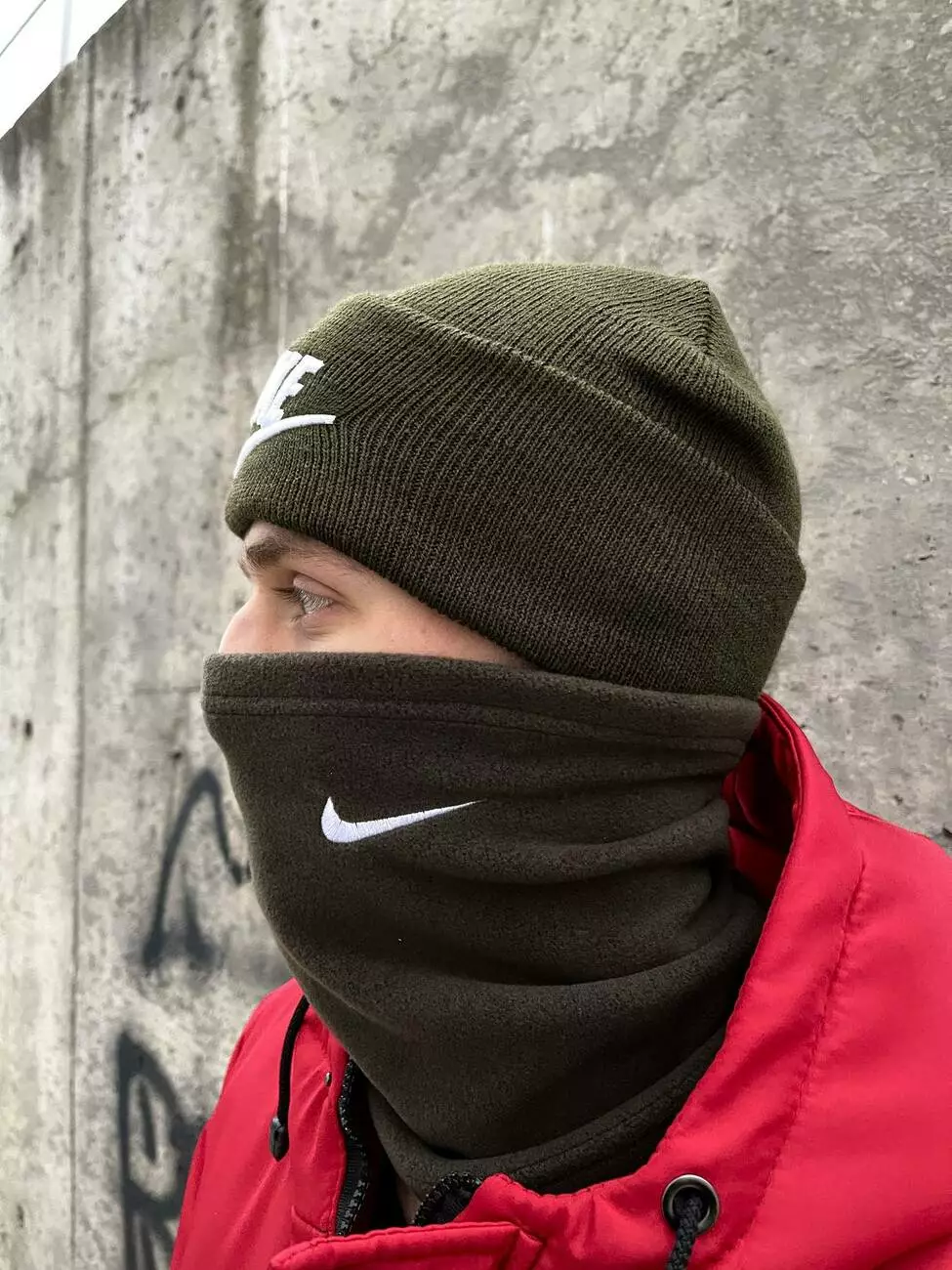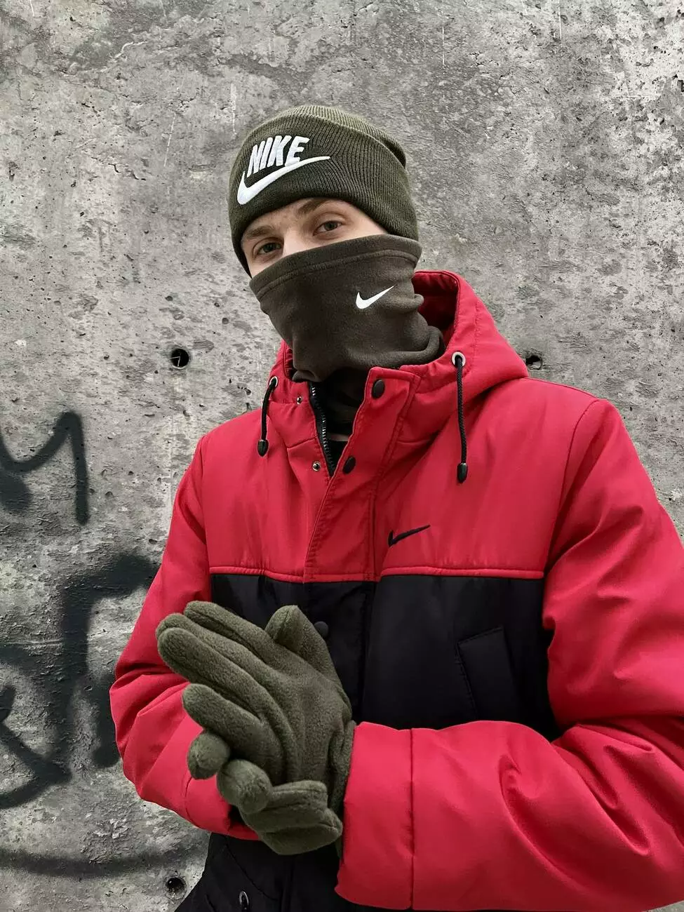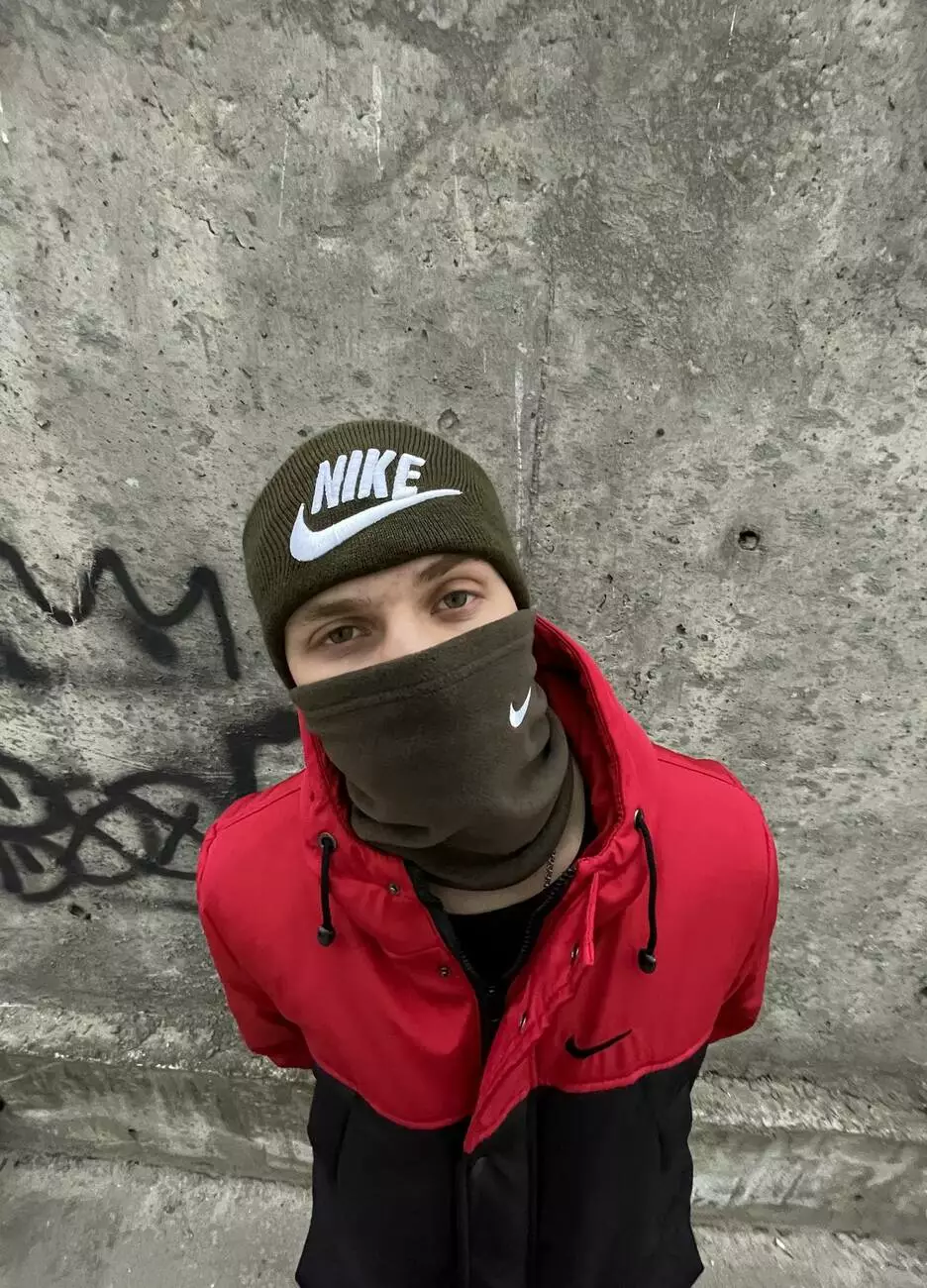 Комплект чоловічий: шапка з додаванням вовни Nike хакі + баф флісовий Nike хакі + рукавички флісові хакі