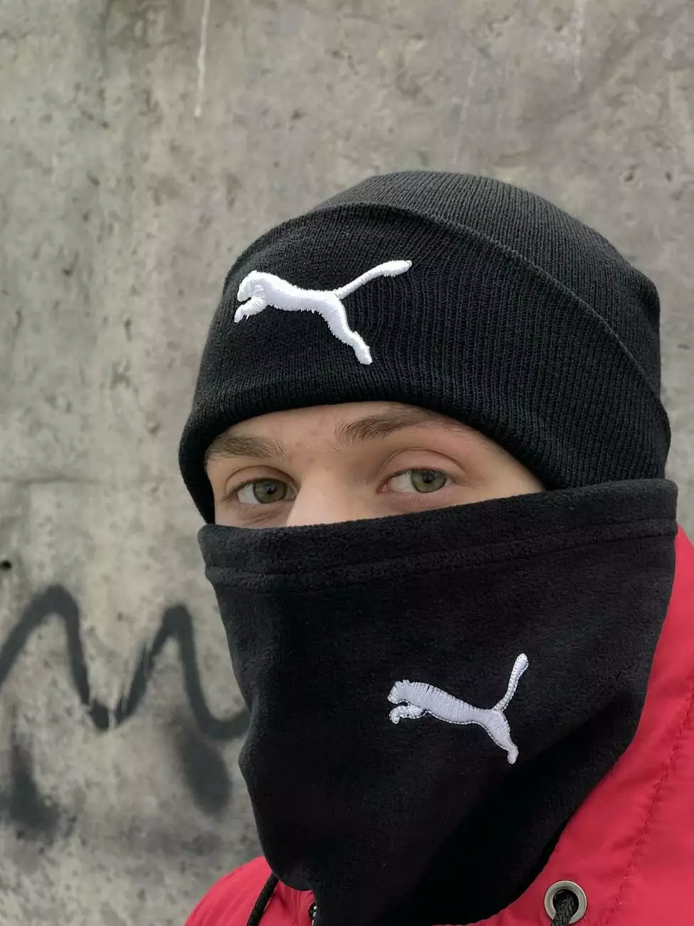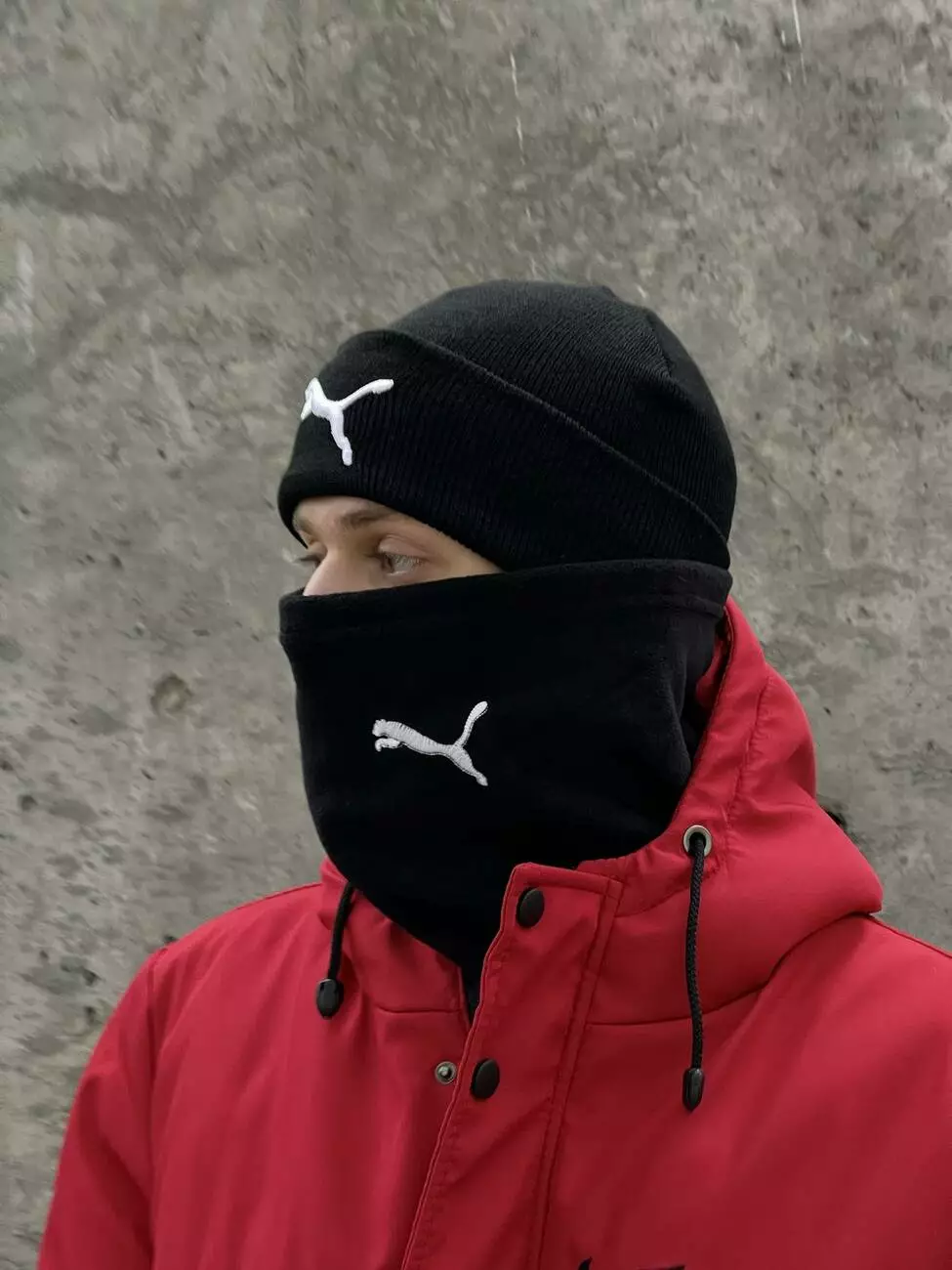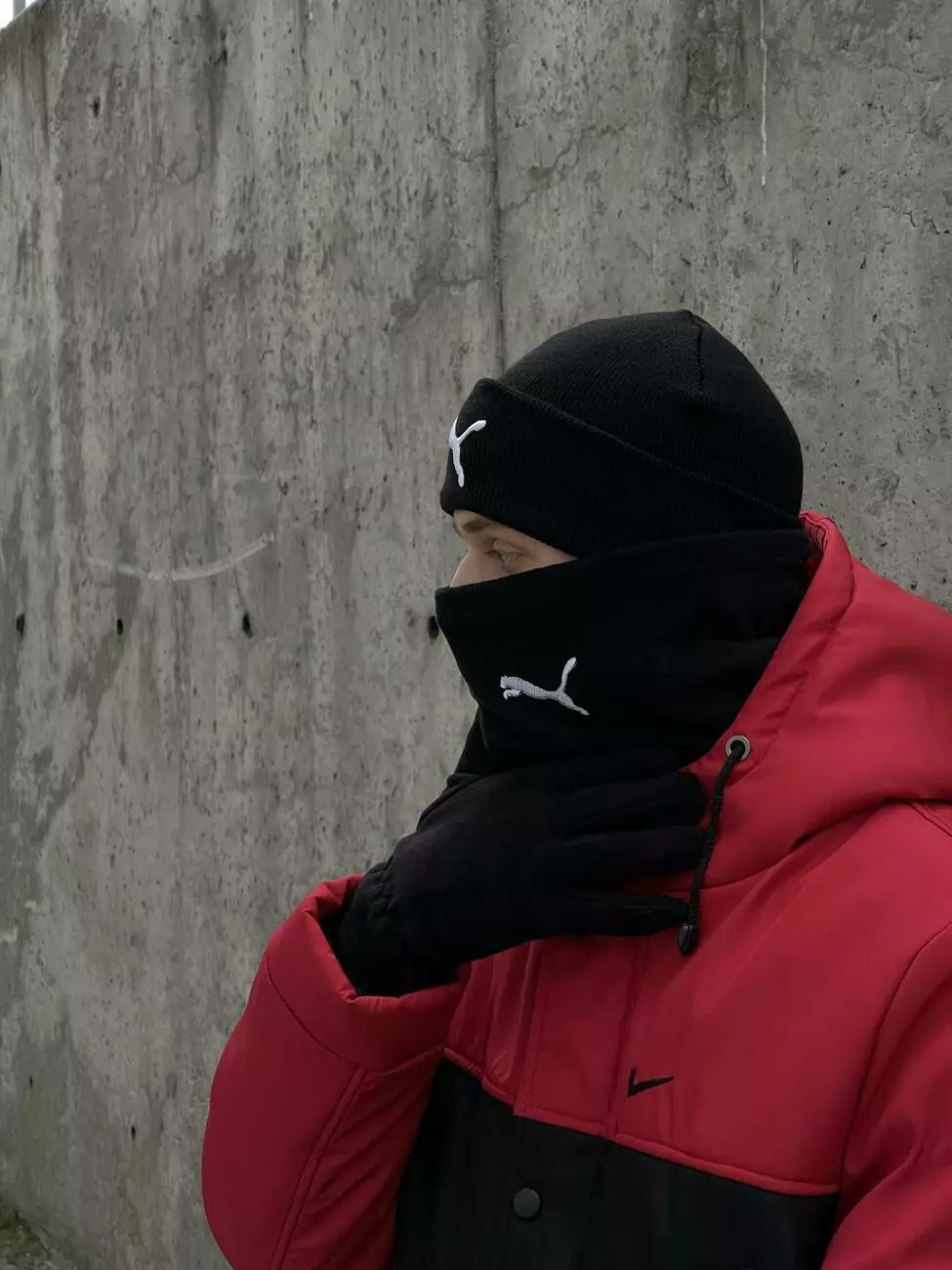 Комплект чоловічий: шапка з додаванням вовни Puma чорна + баф флісовий Puma чорний + рукавички флісові чорні