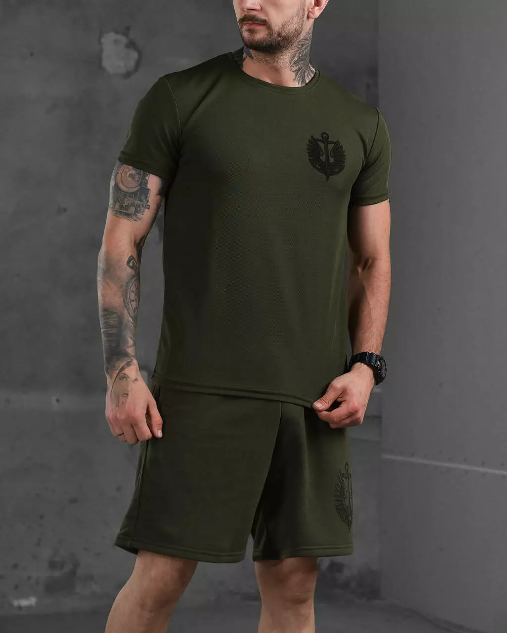 Підготуйтеся до літа з нашим стильним чоловічим комплектом, що містить комфортні шорти та футболку. Шорти виготовлені з легкого дихаючого матеріалу, який ідеально підходить для активного способу життя. У них зручний пояс на зав'язках для ідеальної посадки. Футболка виготовлена з поліестеру, що забезпечує еластичність і комфорт. Вона має стильний принт на грудях і чудово поєднується із шортами.