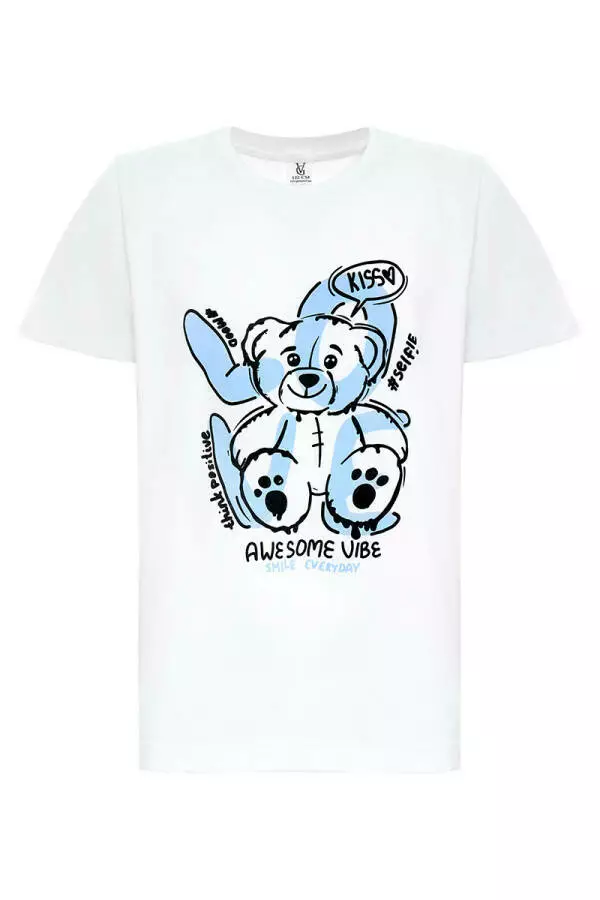 Футболка у білому кольорі прикрашена блакитним принтом, який додає образу грайливості та позитивного настрою. Виготовлена ​​з м'якого та дихаючого матеріалу, футболка забезпечує комфорт протягом усього дня, не стискаючи рухів дитини. Легкий і вільний крій дозволяє малюкові активно рухатися, не відчуваючи дискомфорту. Футболка легко одягається і знімається, що робить її зручною для будь-якого випадку.