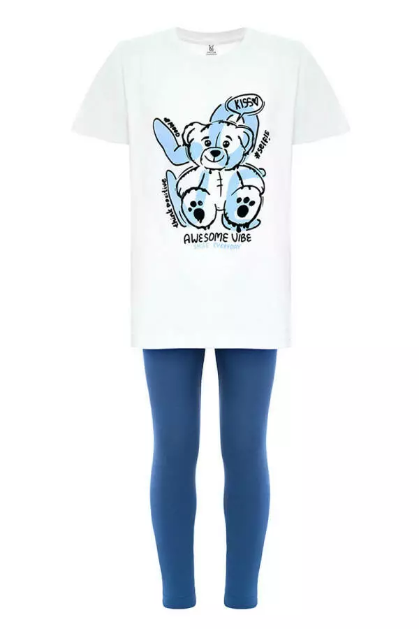 Лосини, виконані в насиченому кольорі індиго, ідеально доповнюють комплект. Лосини зручні як для активних ігор, так і для спокійного відпочинку вдома. Колір індиго додає комплекту стильний та сучасний акцент, гармоніюючи з білим та блакитним кольорами футболки.