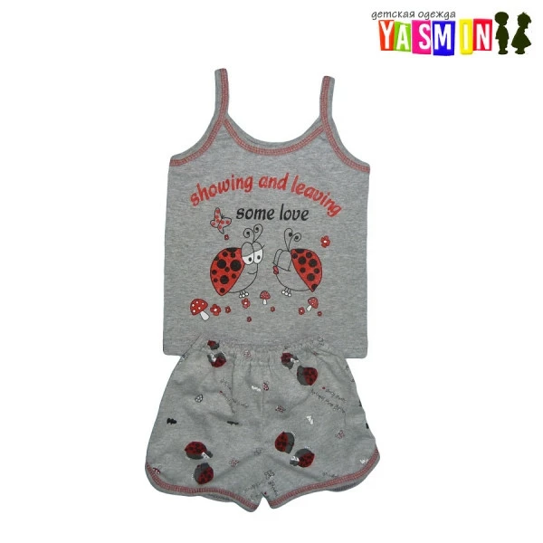 Данная модель комплекта для девочек состоит из майки с рисунком божьих коровок и шорт. Ваш ребенок с удовольствием будет надевать этот удобный и красивый комплект, который прекрасно подходит для жаркого летнего сезона. Майку и шорты можно также носить и дома.
