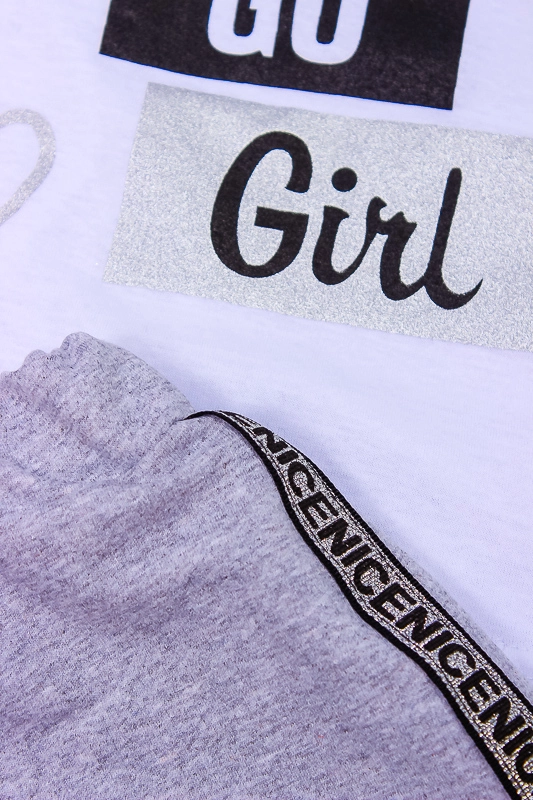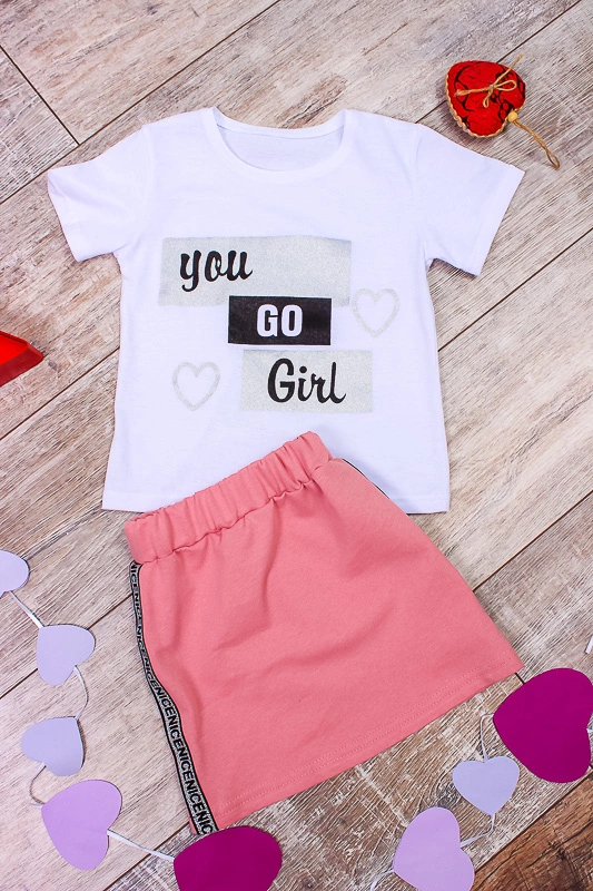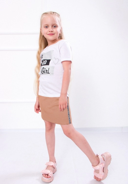 Модний український бренд «Трикотажний Край» представляє стильний костюм для дівчинки який буде до лиця кожній сучасній дівчинці, яка ретельно стежить за модою і за своїм зовнішнім виглядом! Він складається зі спідниці і футболки з коротким рукавом. Ці речі, безумовно, чудово виглядають разом, але їх також можна з легкістю комбінувати з іншим одягом і створювати різноманітні стильні образи! Костюм виконаний в пастельних-тонах і доповнений блискучим лампасом з боків спідниці, і стильним принтом по переду спідниці, це надає йому якусь елегантність, тому такий комплект можна сміливо вдягати для святкових виходів. Спідниця має еластичний пояс, що забезпечує ще більш комфортну посадку. Футболка виконана з полотна кулир (100% бавовна), спідниця з полотна двунитка (склад: 98% поліестер, 2% еластан).
