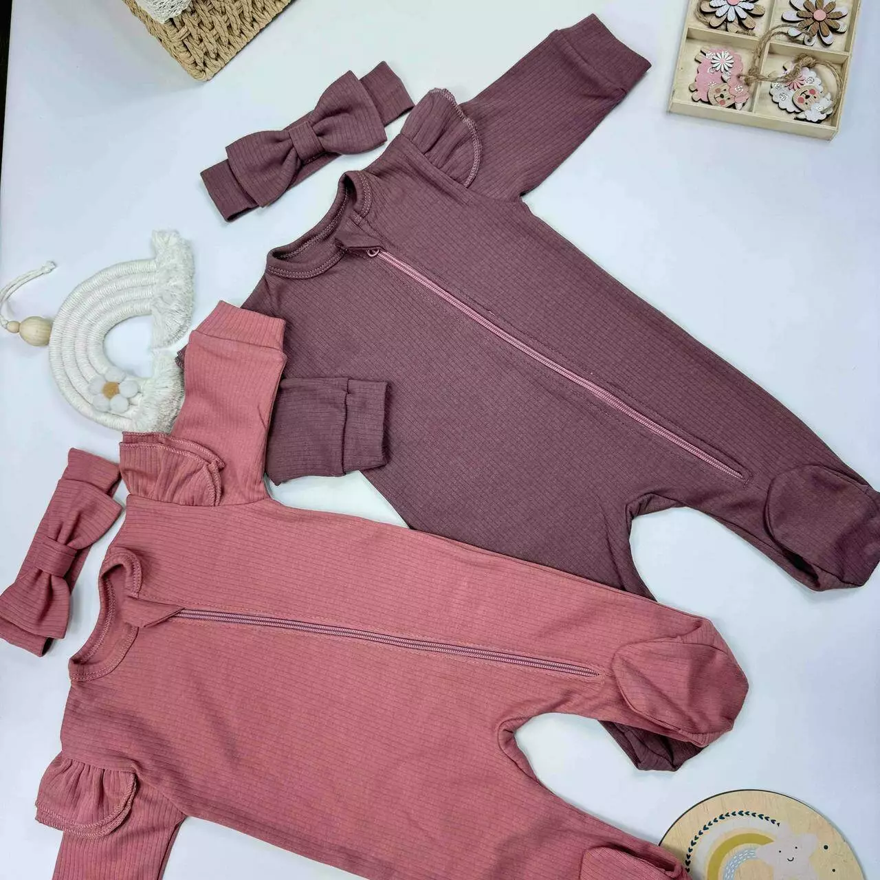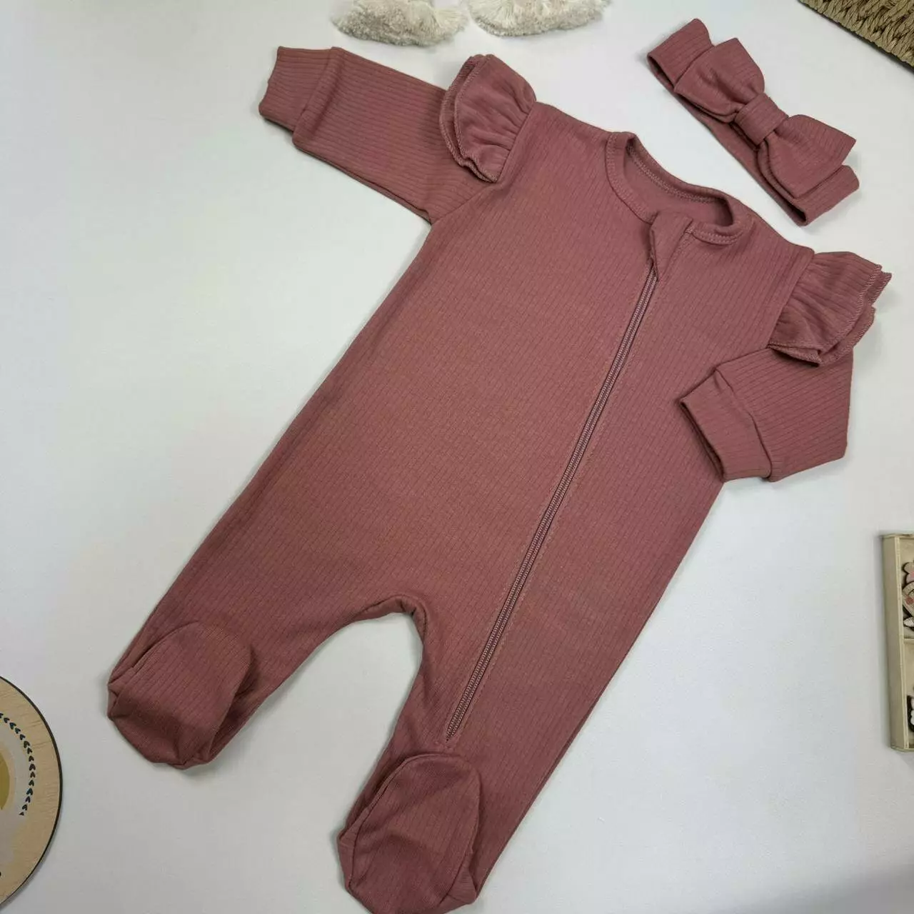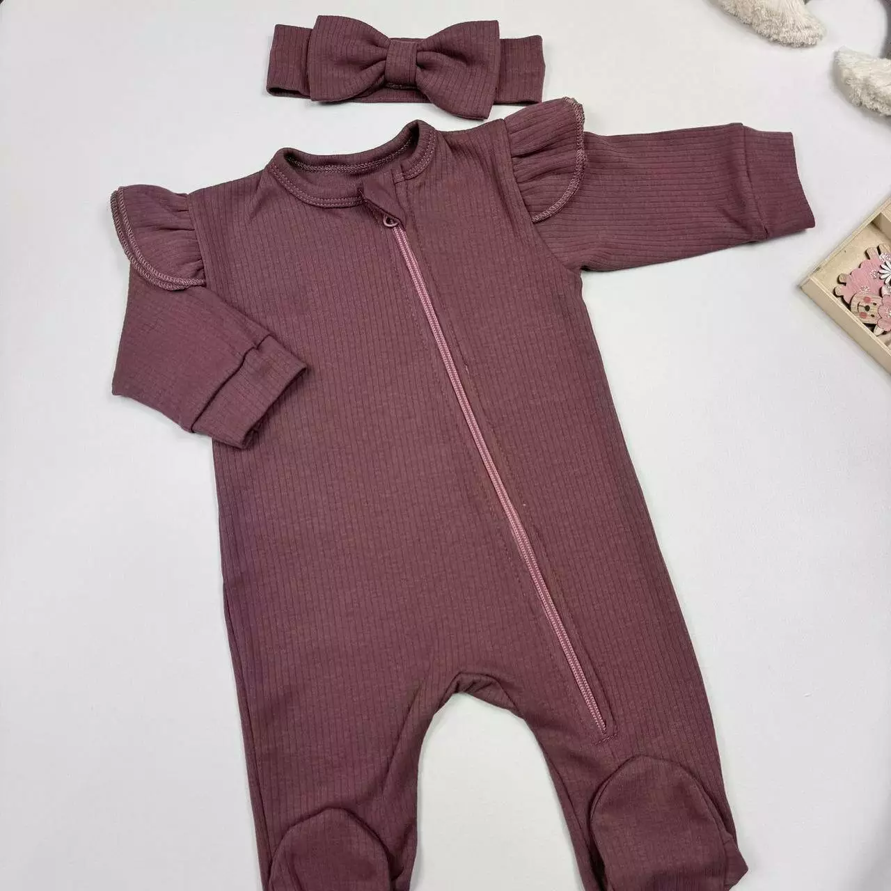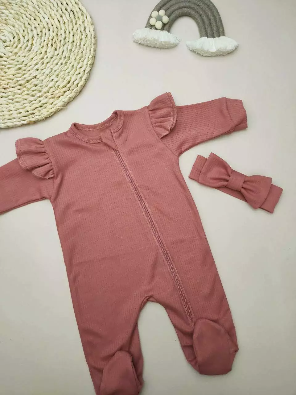 Уютный комплект из интерлока рубчик включает человечек с рюшами и