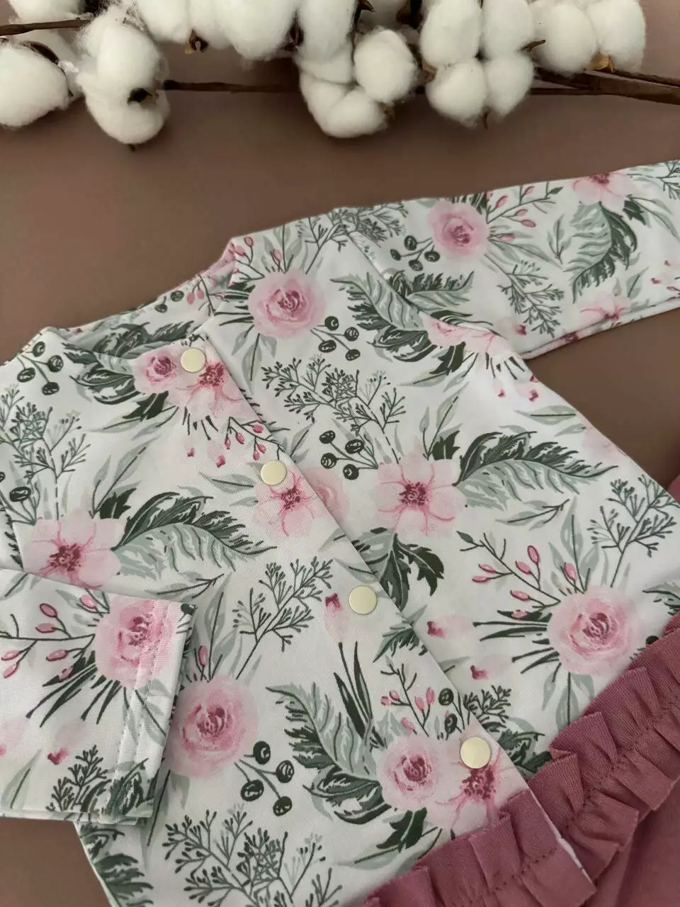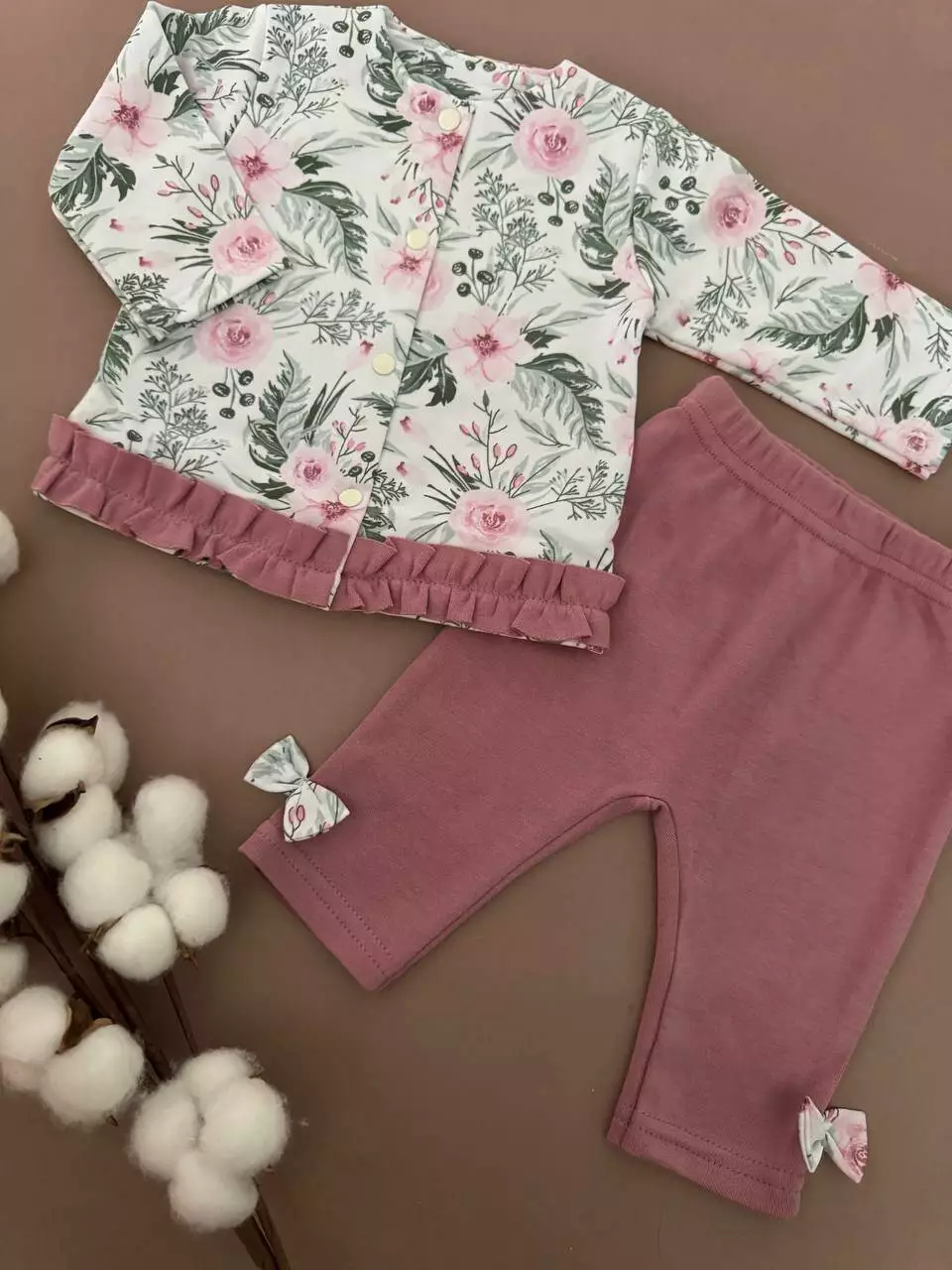 Представляем комплект одежды для новорожденной девочки, который станет ідеальным решением для ежедневного использования. В него входят мягкая кофточка и штанишки, выполненные из качественной ткани — двунитка без начёса. Этот трикотаж комфортный, гипоаллергенный и прекрасно дышит, что особенно важно для новорожденных.