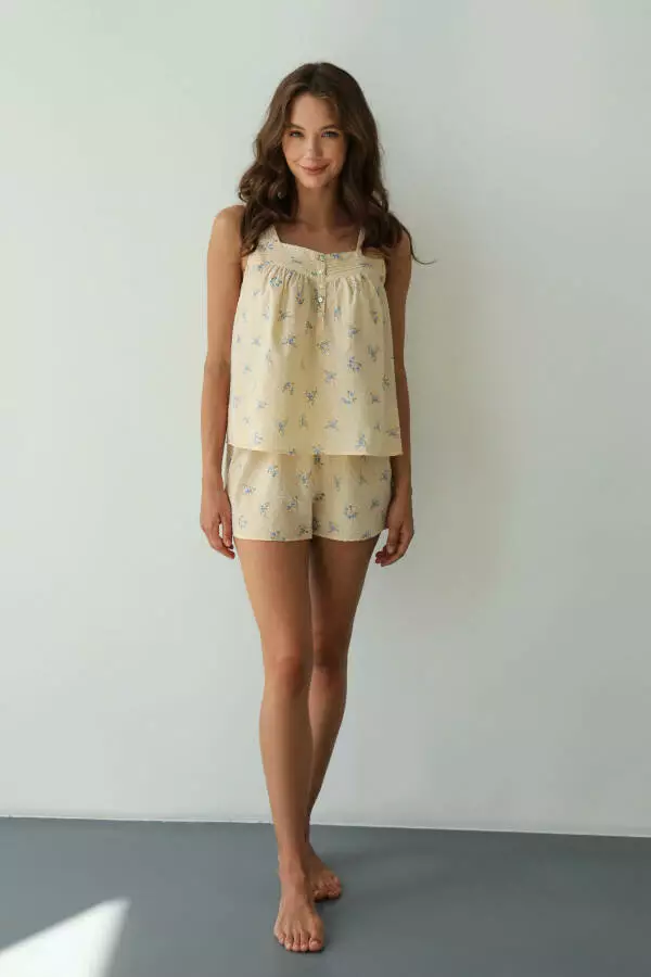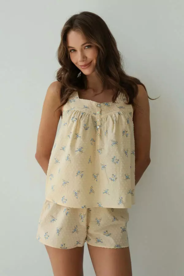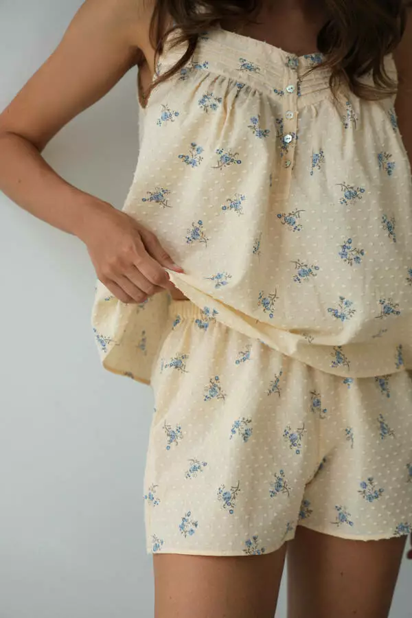Шорти з еластичним поясом забезпечують комфортну посадку на талії, не створюючи тиску, що дозволяє зручно рухатися та насолоджуватися сном без жодних незручностей. Вільний крій шортів забезпечує легкість та свободу рухів, а їхня оптимальна довжина додає образу грайливості. Квітковий принт на шортах гармонійно поєднується з майкою, створюючи цілісний і стильний комплект для дому та сну.