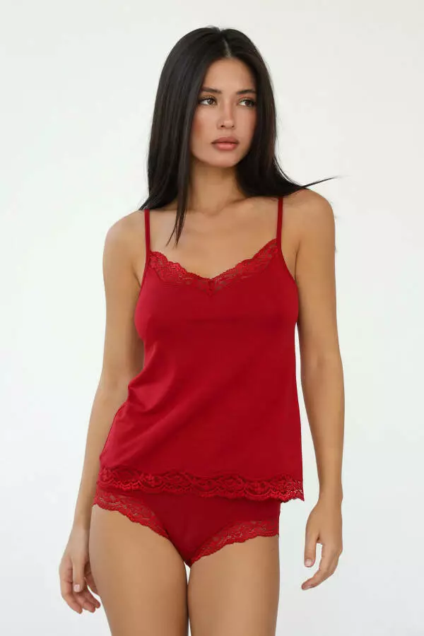 Бордовий колір додає комплекту особливого шарму та елегантності. Цей насичений відтінок виглядає розкішно і додає образу загадковості та жіночності. Він підходить для будь-якого тону шкіри та додає нотку вишуканості навіть у домашньому образі.