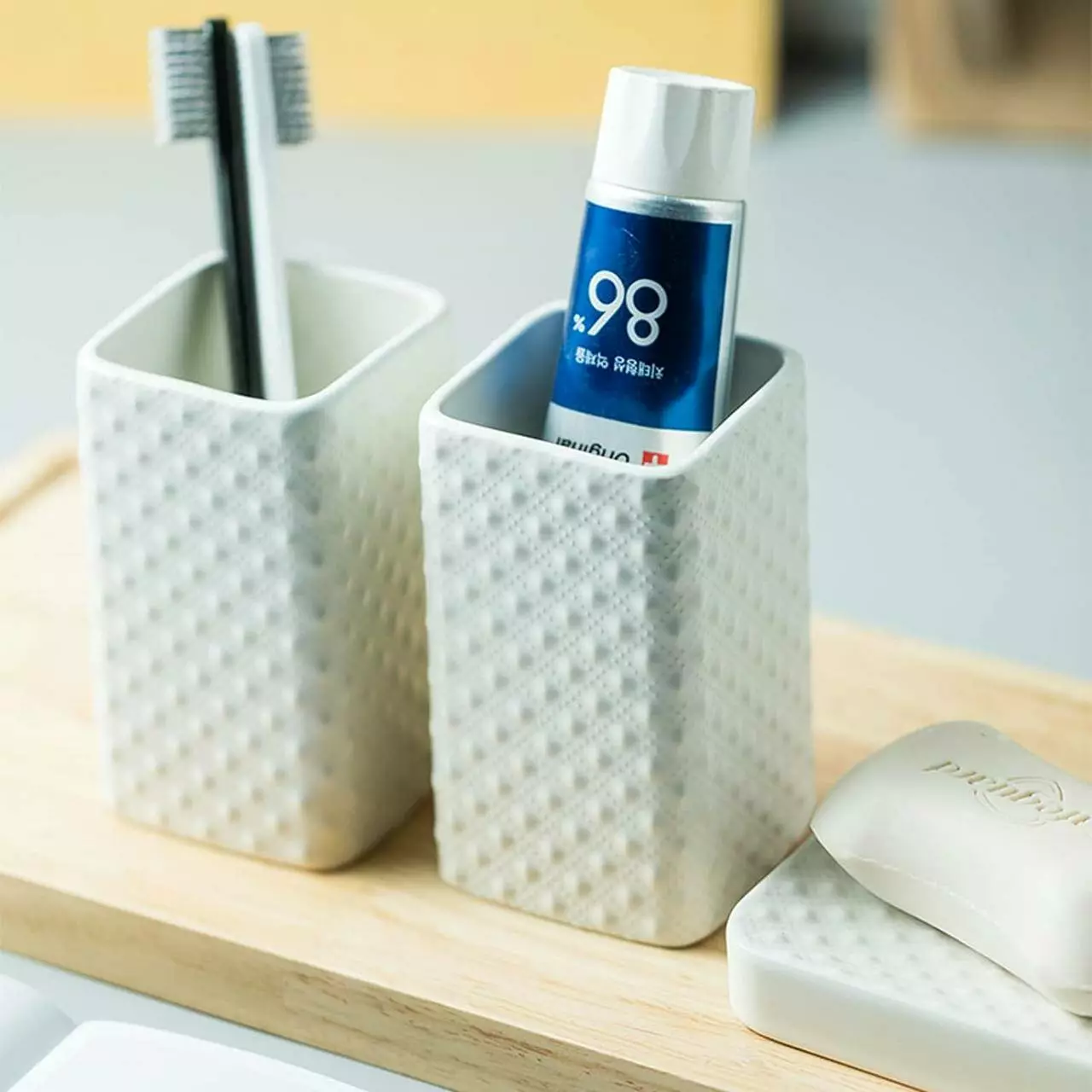 Він включає в себе дозатор для мила, мильницю і стакани зі стильним